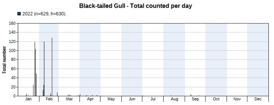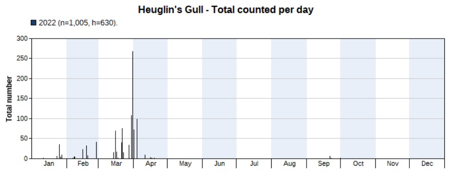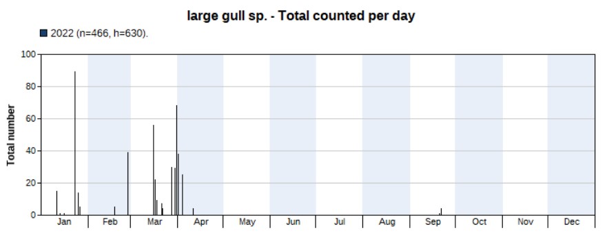 Similar numbers in 2022 (139) compared to 2021 (151). Highest count 44 on 30 March. First record on 8 February, last one on 1 October.
