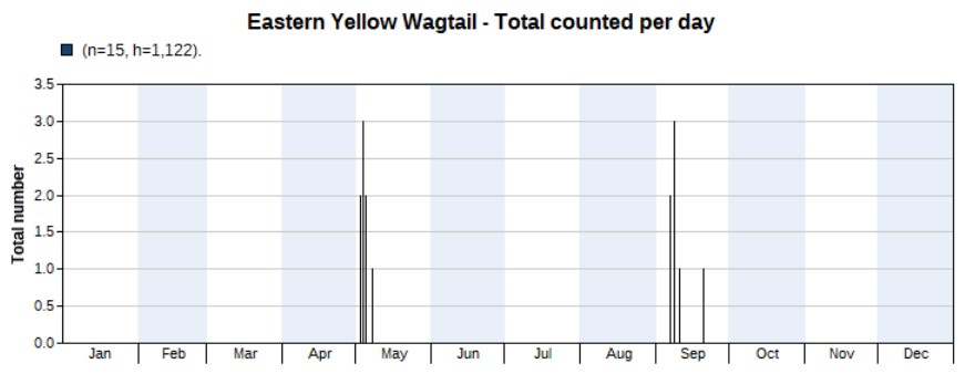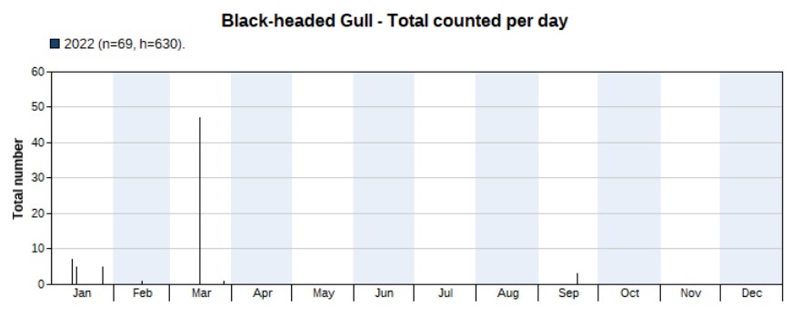 Also a local breeder, of which the graph only shows counts of birds of which we believe were migrants. A total of 92 birds were counted. Obviously, a peak in spring, with the highest count of 27 on 5 May. First record on 3 April, last one on 21 May. Surprisingly, no autumn records in 2022.