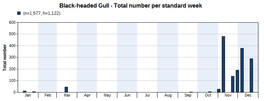 Mostly singles in early spring and early autumn. Four on 3 April.