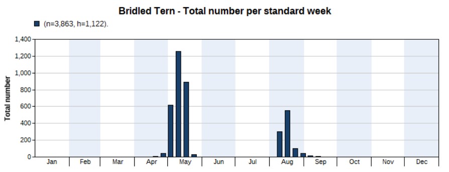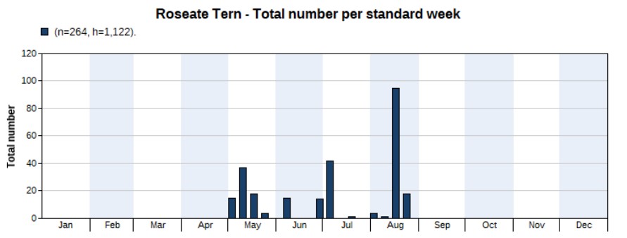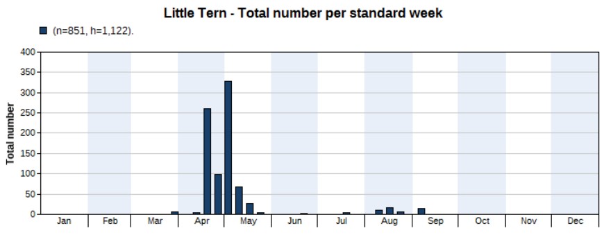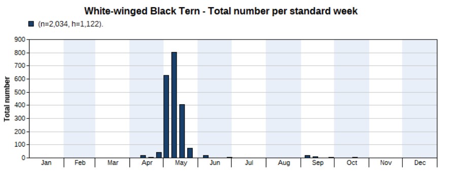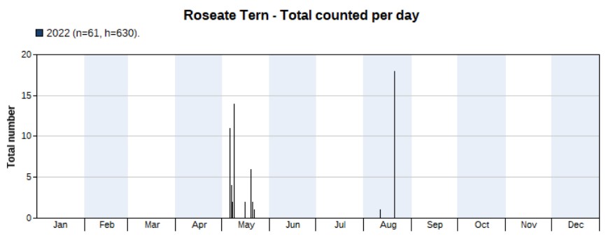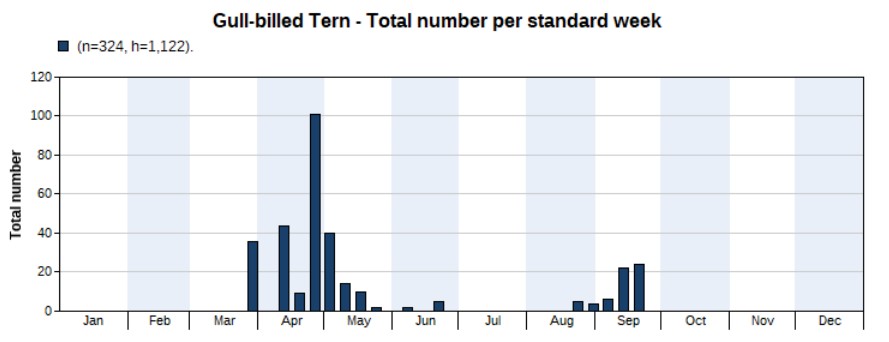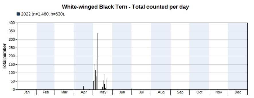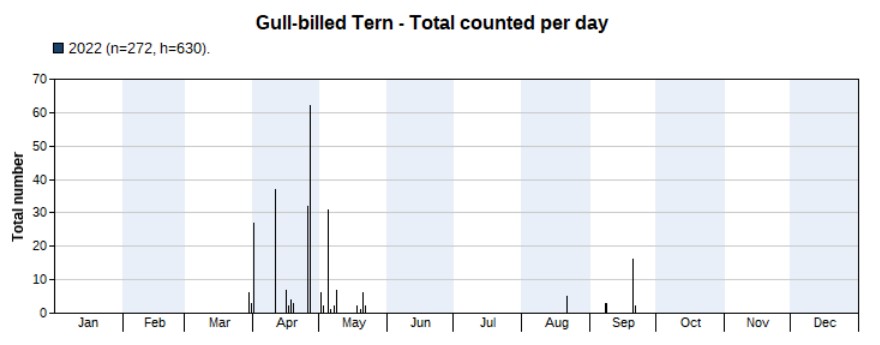 A total of 3,700 were counted in 2022, much more than the 1,176 in 2021. Again, the opposite of the previous year: the peak appeared in spring, not in autumn. And again, that’s mainly because of more spring surveys in 2022 than in 2021. But note that we’re not sure if the peak really is in spring, as there are a large number of unidentified terns seen in autumn of which many might be Common Terns. Highest counts 456 on 5 May and 447 on 4 May. First record on 16 March, last one on 1 October.
