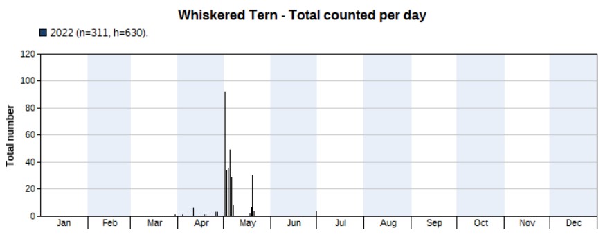 Another tern species of which we had higher counts in 2022 (311) than in 2021 (88). Highest count 92 on 1 May. First record on 29 March, last one on 30 June. So, no autumn sightings in 2022.