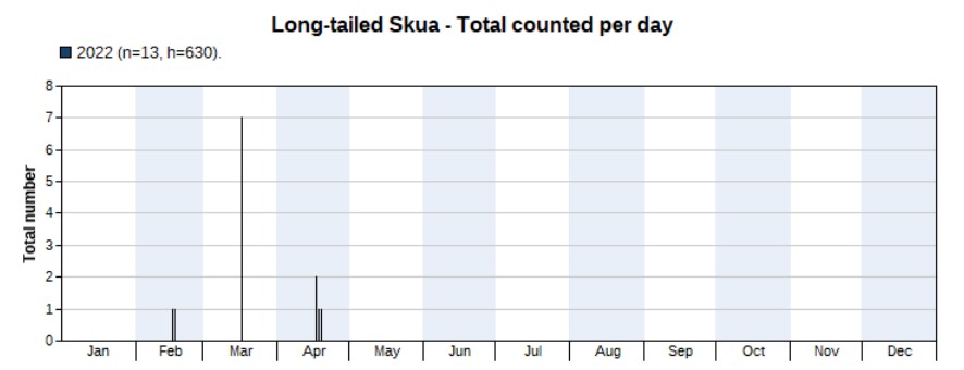 With surveys in early spring, we counted much more Pomarine Jaegers in 2022 (46) than in 2021 (2). They migrate pass Po Toi much earlier than Parasitic Jaegers. First record on 16 February, last one on 18 April. Highest count 23 on 18 February.