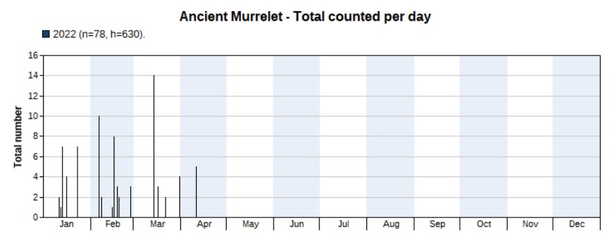 We didn’t record any Ancient Murrelets in 2021, but a total of 78 in 2022. The reason is probably twofold: firstly, they might just be much scarcer in November and December, and secondly there were no surveys in 2021 until 29 March. In 2022, we record almost all Ancient Murrelets from January to March and only five on one day in early April. Highest count was 14 on 13 March, a new high count for Hong Kong. First record on 11 January, last one on 10 April.