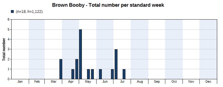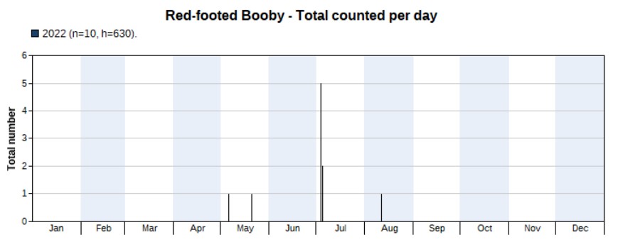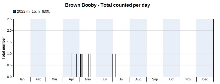 2022 turned out to be a great year for Brown Boobies as well, with no less than 15 seen. There have never been so many records in Hong Kong. Prior to 2022 there were mostly single records per year and not annual. It’s unclear to me whether 2022 was exceptional or just the result of more surveys. Highest counts two on 29 March and 6 May. First record on 29 March, last one on 5 July.