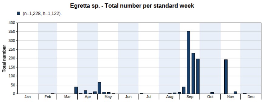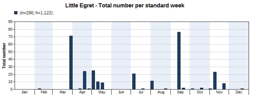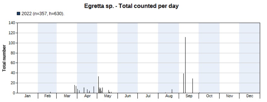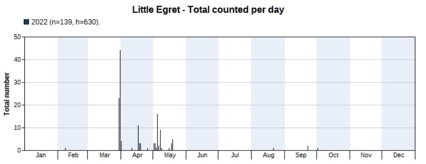 More than twice as much counted in 2022 (386) than in 2021 (150). Highest count 132 on 2 May. First record on 21 March, last one on 30 September. The peak indeed occurs in May, but note the large number of unidentified egrets (see above), with a peak in September, of which many could be Eastern Cattle Egrets.