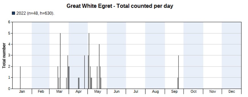 No records in 2021, but two birds in a flock of other egrets on 4 May 2022.