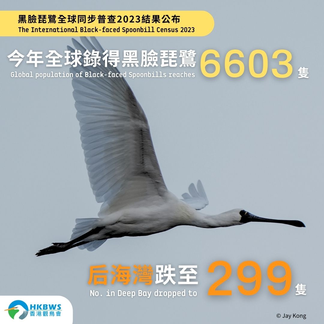 由香港觀鳥會統籌的「黑臉琵鷺全球同步普查2023」已於1月6至8日完成。本年度黑臉琵鷺全球數量達6,603隻,為歷年新高,較去年上升7.2%,增加了441隻。后海灣(包括香港及深圳)錄得299隻,較去年減少了70隻,下降19%;與2021年相比,亦下降了11%。