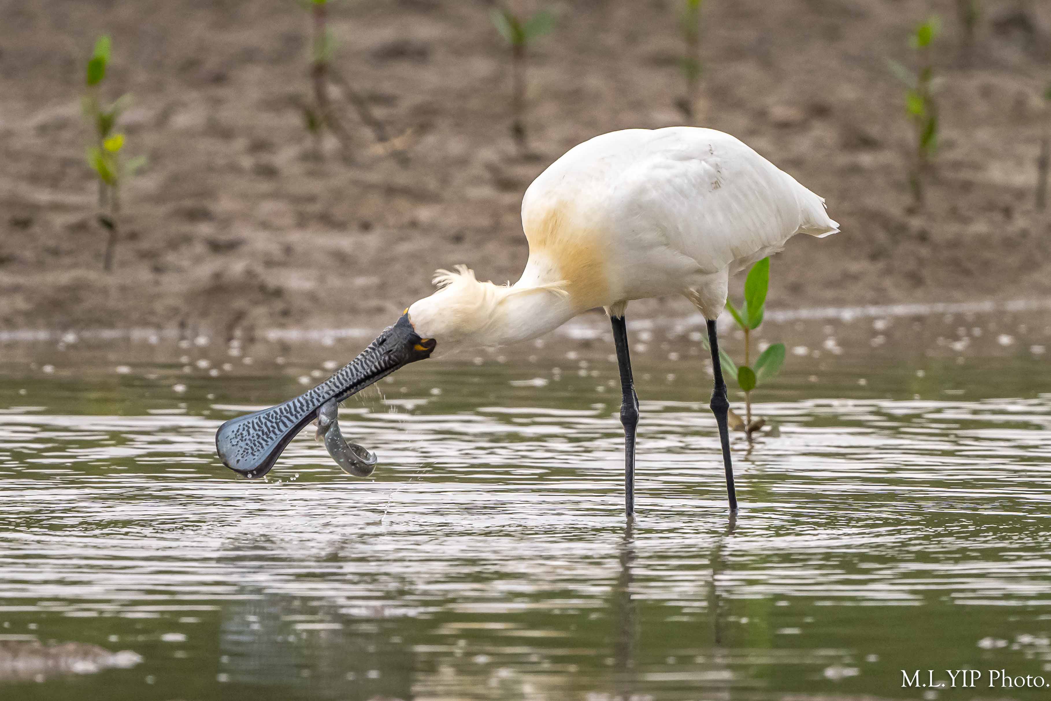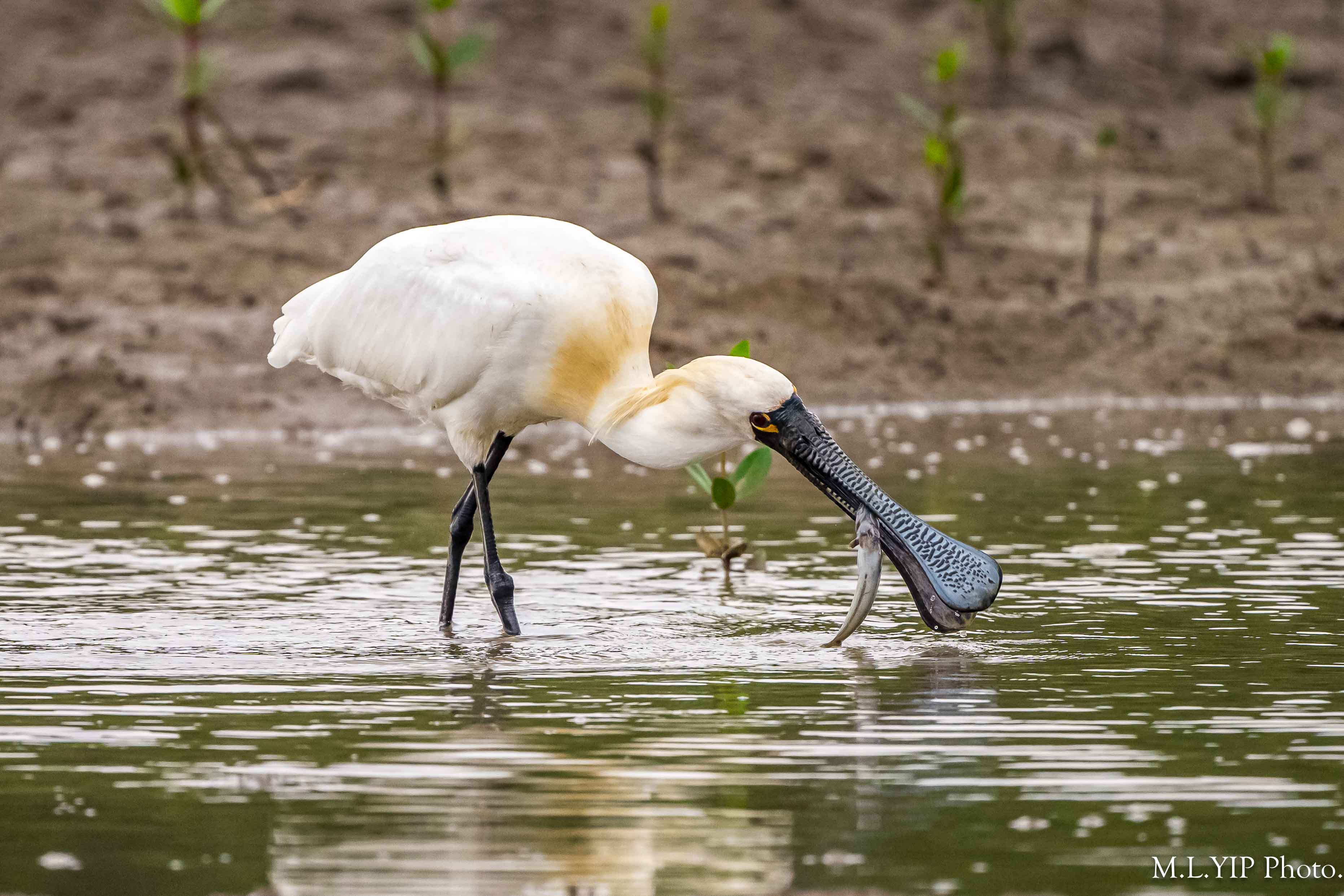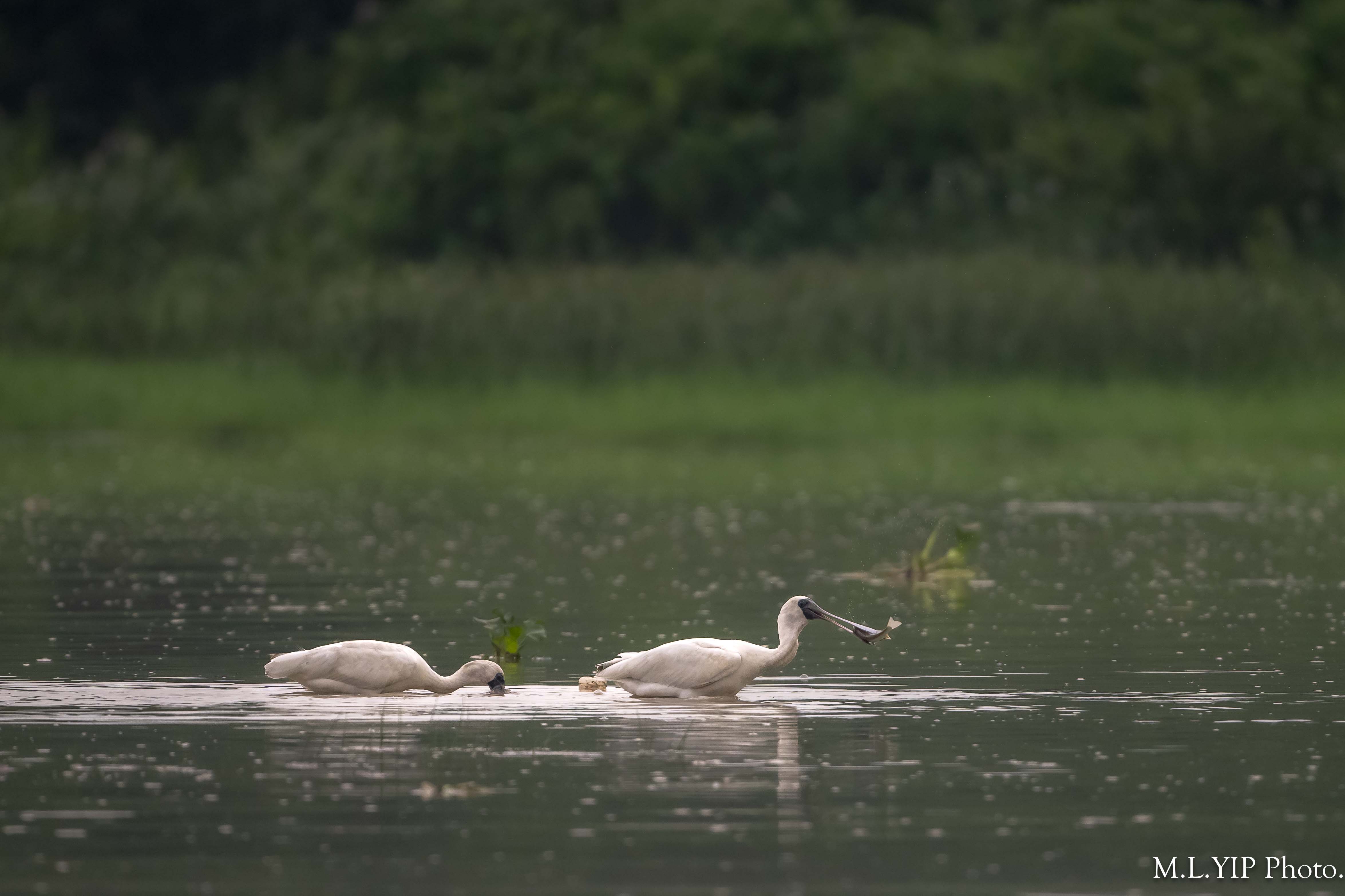 黑臉琵鷺叼魚圖.