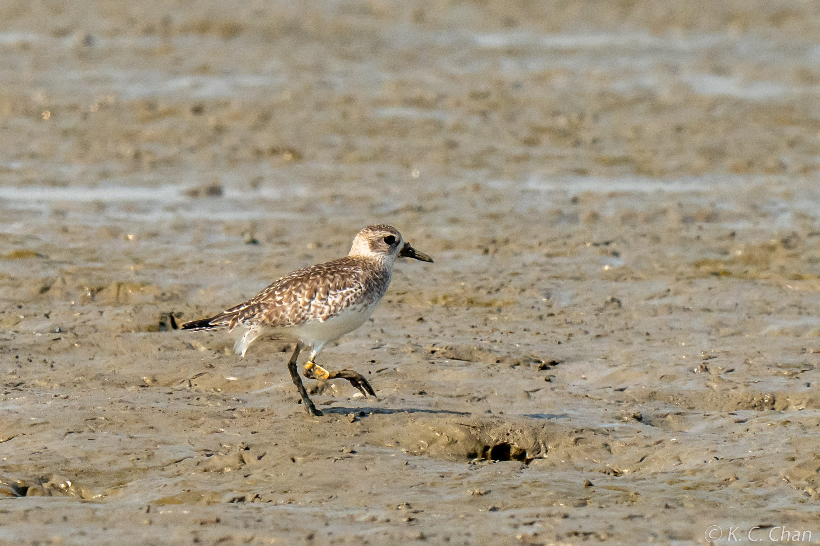 Grey Plover C2 - 18-Apr-2011, 1st winter; it is now 15.5 years old! 30 sightings until Feb-2022 and then reappear in Mar-2025 at Lau Fau Shan.