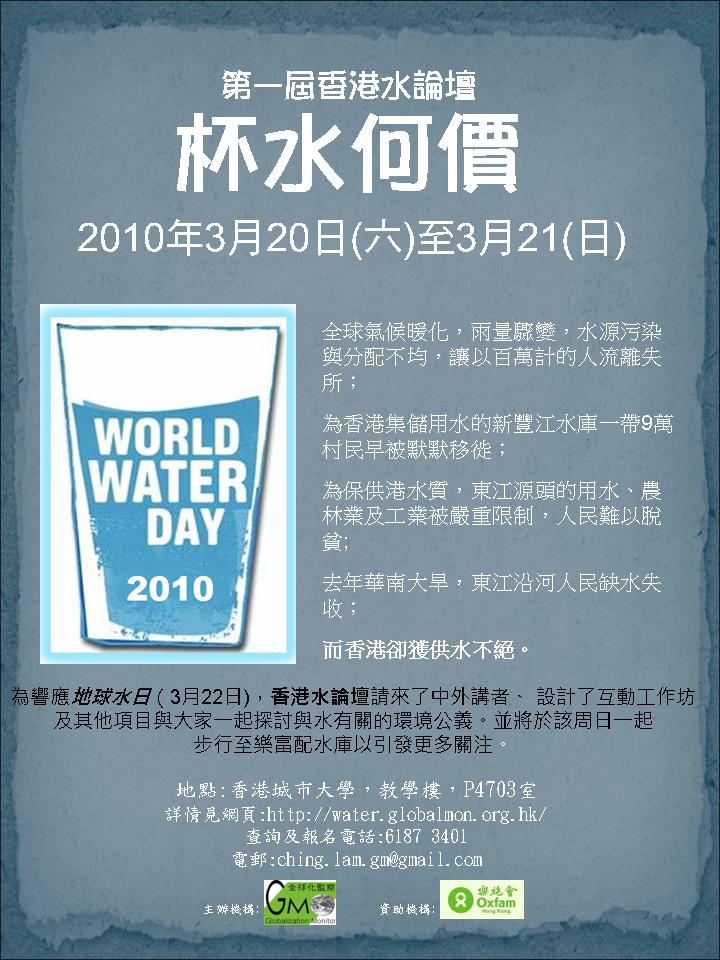 為響應3月22日聯合國的「世界水日」,本地民間團體「 全球化監察」將於本年3月20至21日於香港城市大學舉辦為期兩天,以「杯水何價」為題的香港水論壇,現誠邀 貴機構及會員出席參與,一起探討一連串與水有關的環境公義問題。主辦團體亦歡迎友好有參與主持一節的工作坊。
