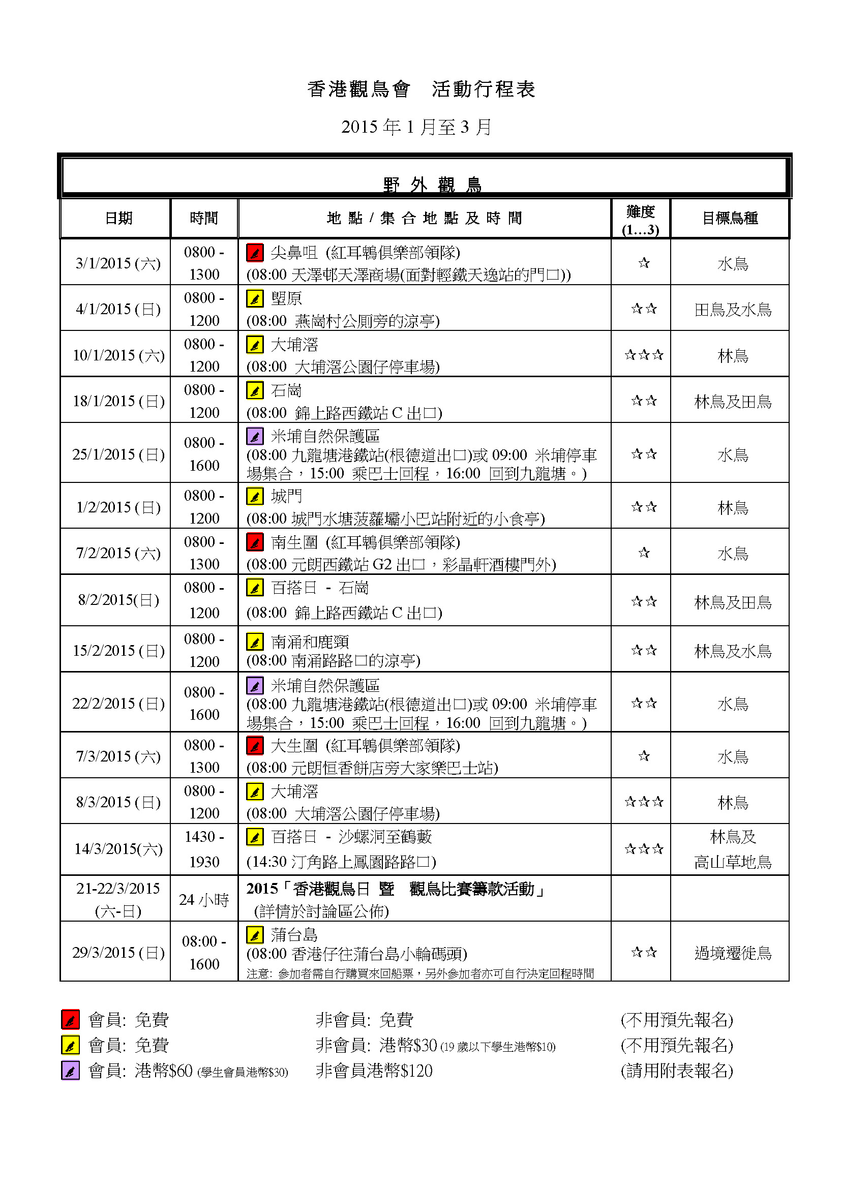 2015年1-3月戶外觀鳥活動時間表 Jan-Mar 2015 Outing Timetable