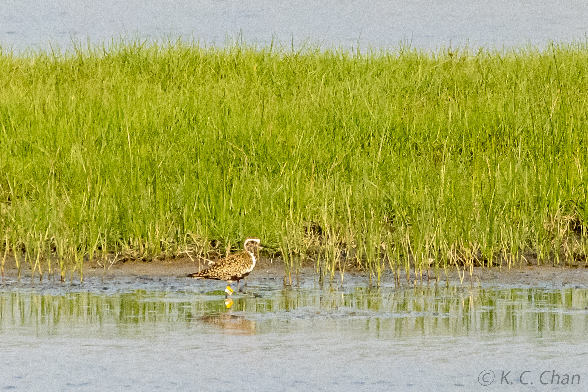 This is Pacific Golden Plover D8 ringed on 20-Sep-20. Our team made a mistake putting the yellow colour flag on top. It has been reported from Shenzhen many times in Oct-Nov; recorded at Mai Po in Feb and Mar.
