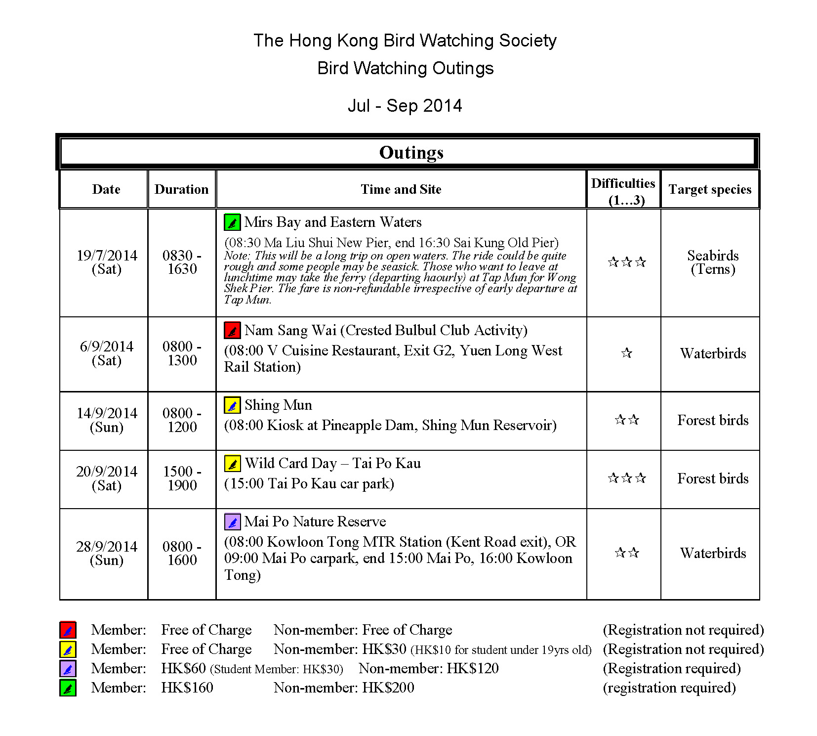 2014年7-9月戶外觀鳥活動時間表 Jul - Sep 2014 Outing Timetable