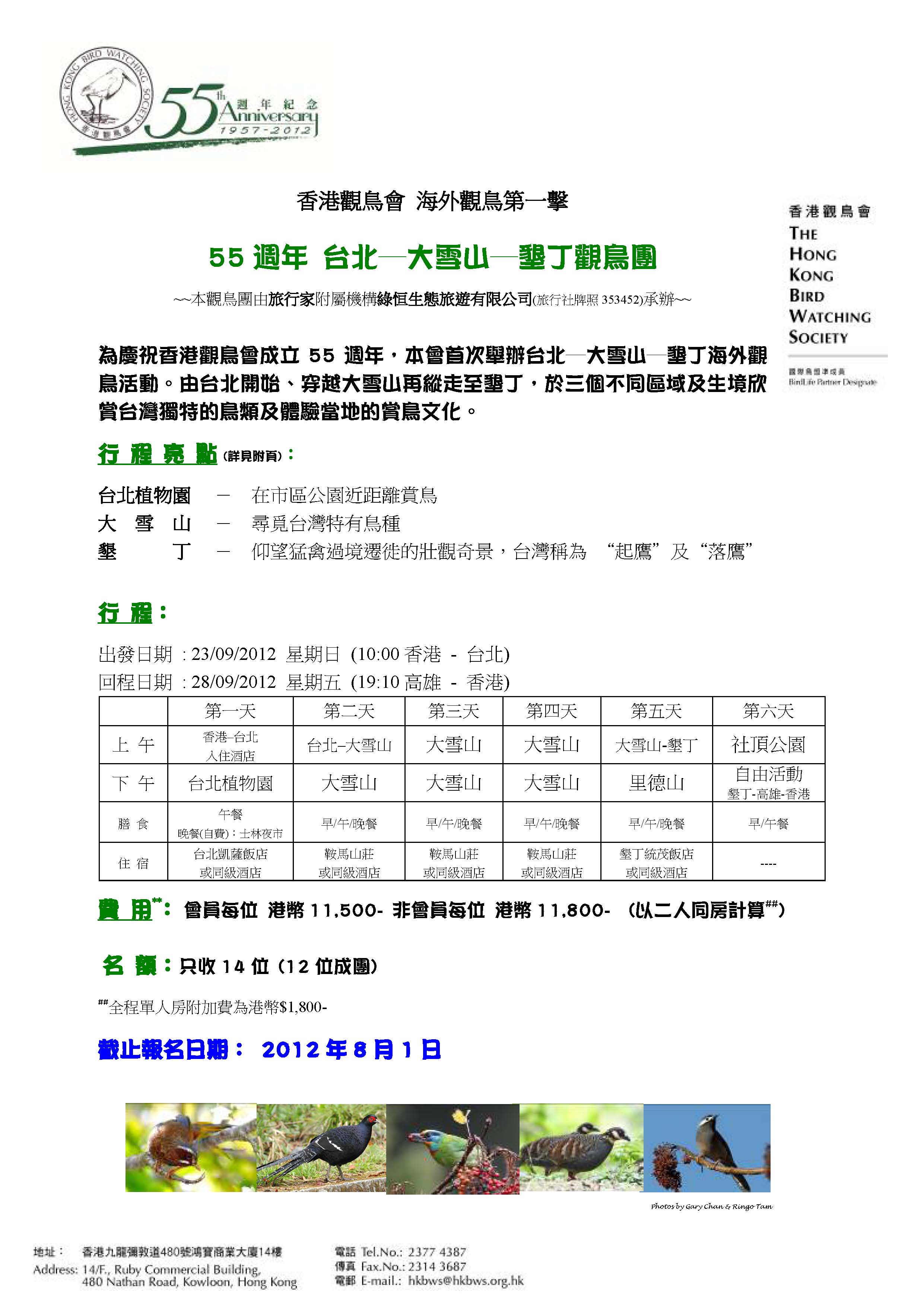 原帖由 lexusjohn 於 18/08/2012 11:41 發表 雖然今次不成團, 但請左假, 真的想去 , 請問有無其他會員有興趣結伴同行, 現正查詢台灣鳥導,短訊聯絡 ...