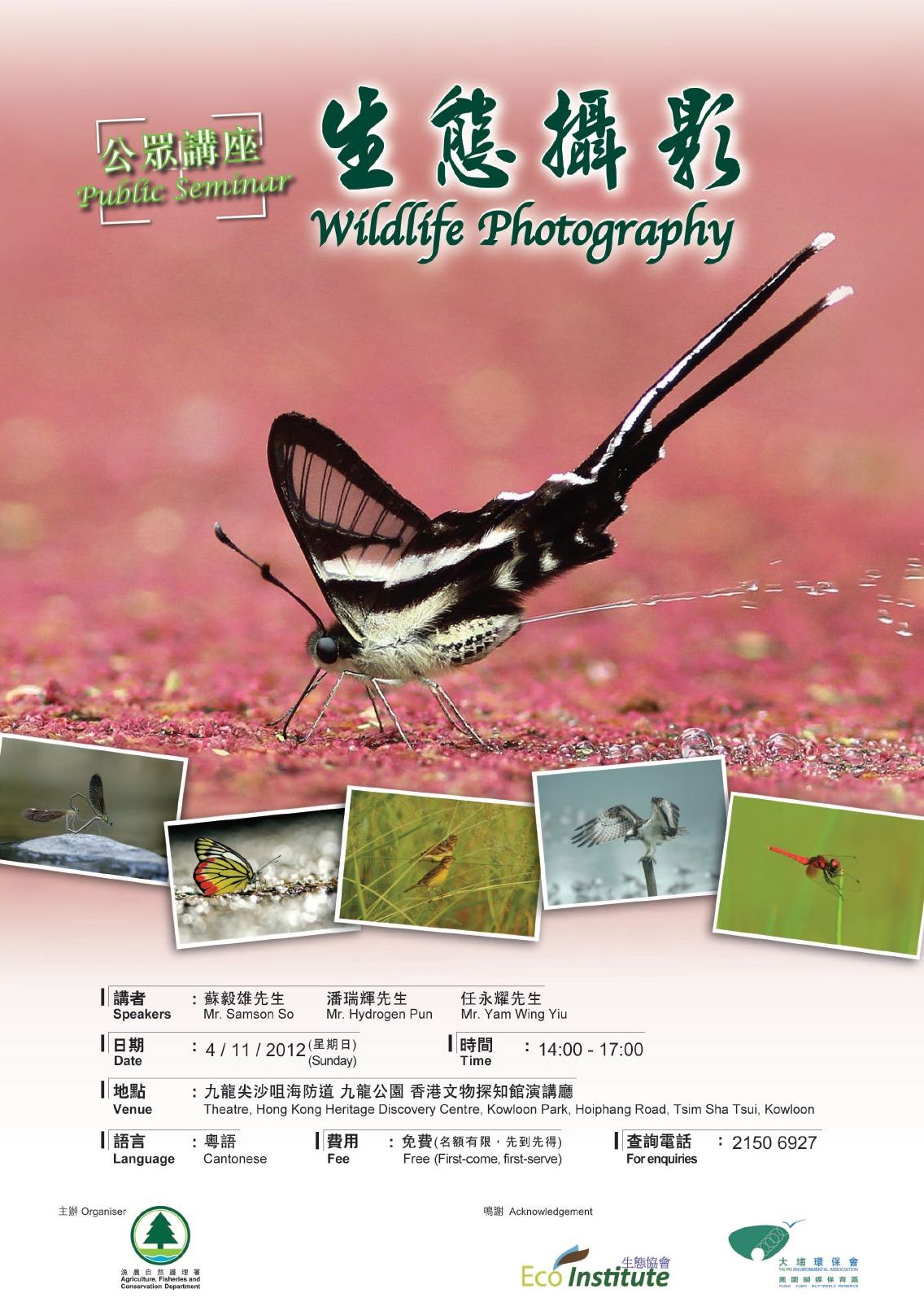 雀鳥、蝴蝶和蜻蜓不僅是我們所熟識的生物,亦是生態攝影師所喜歡的拍攝題材。攝影師首先要找尋拍攝的對象,再配合適當的器材,並以拍攝角度、光圈快門的運用與及光影技巧等,創造理想的攝影作品。是次講座,講者會向大家分享生態攝影的竅門和技術,解說對大自然的正面態度,鼓勵珍惜自然資源。