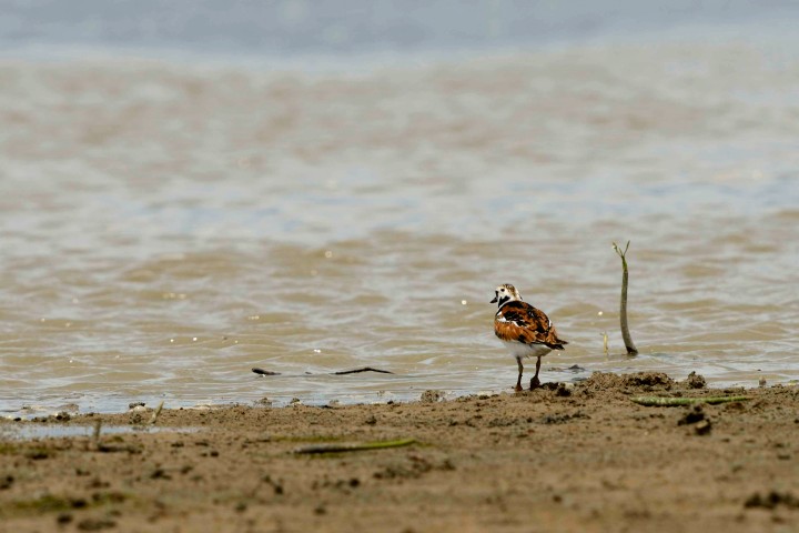 A ruddy turnstone gazed at the high water rushing in at Maipo on May 20th . It waited until the water receded to open up the mudflat for foraging.