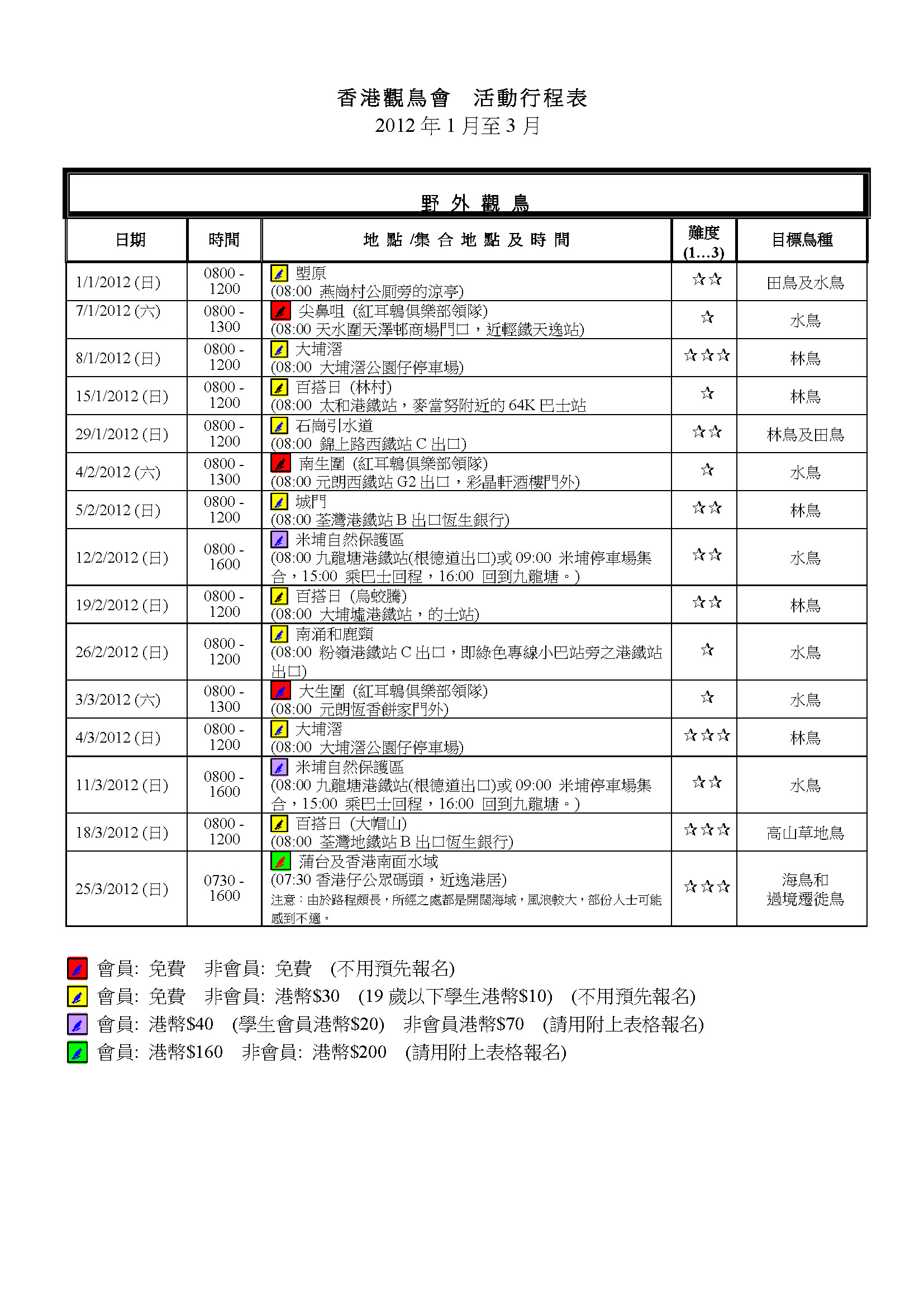 2012年1-6月戶外觀鳥活動時間表Jan-Jun2012 Outing Timetable