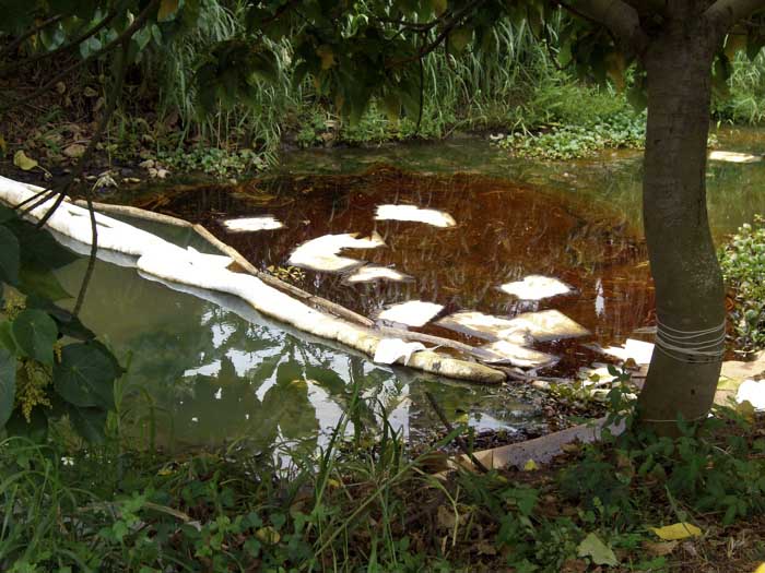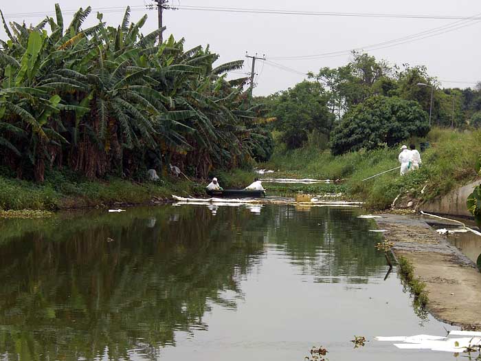 in the river which crosses the access road to Mai Po. Although there are men there trying their best to remove the waste, when the tide comes in( I believe it is tidal) it will spread