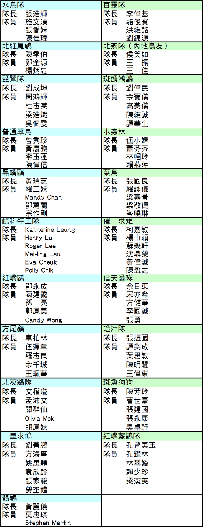 香港觀鳥大賽2010參賽名單 HK Bird Race 2010 List of Teams [1/4更新]
