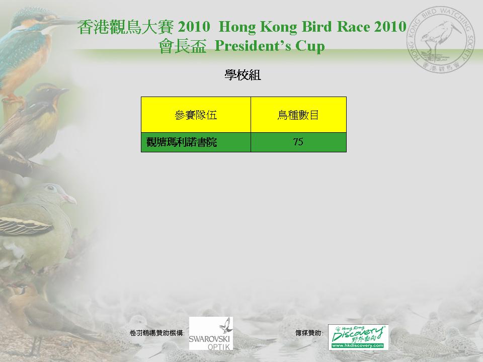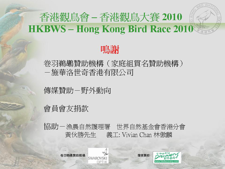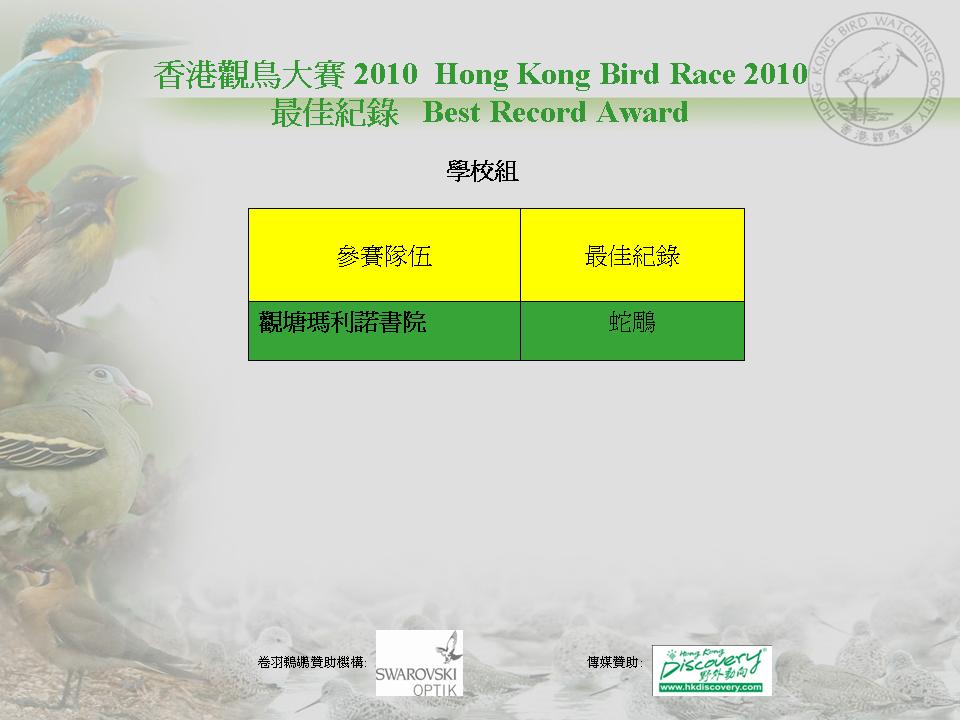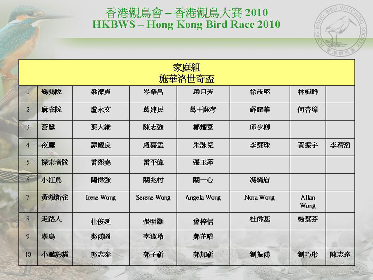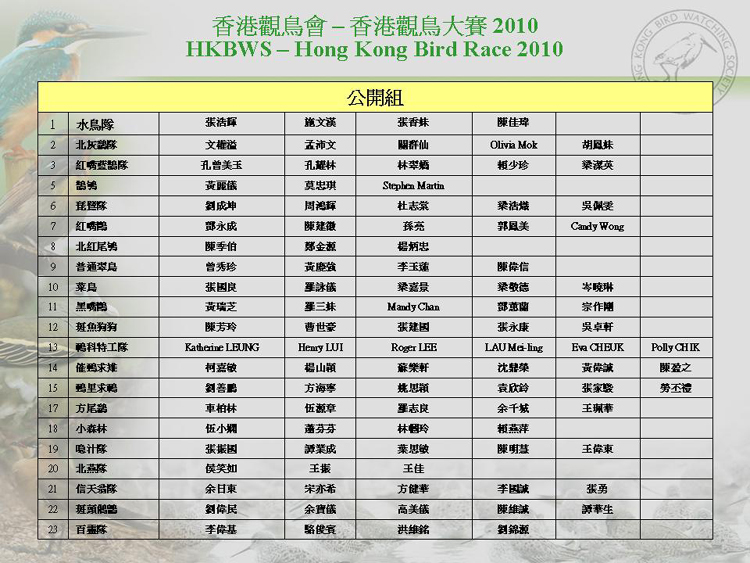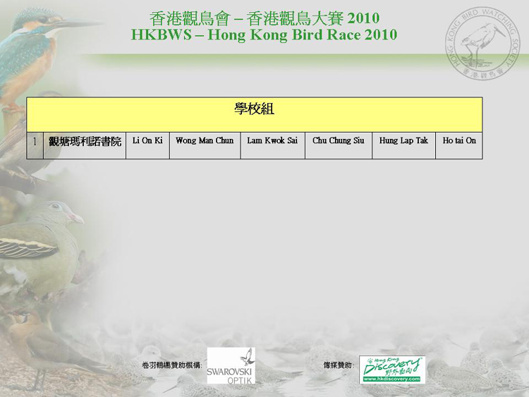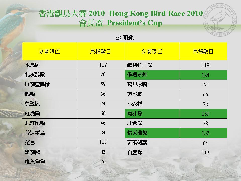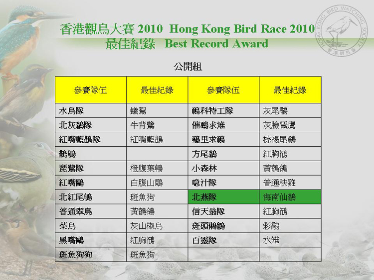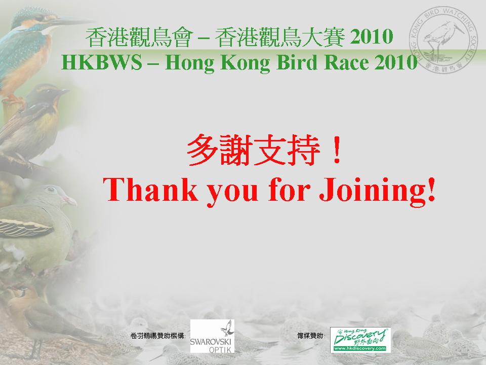 恭喜哂喼汁(Give up)隊、小靈豹貓隊及觀塘瑪利諾書院隊,也恭喜得到其它獎項及其它參隊伍,我地大家都係勝利者,有這麼多人關心香港鳥類,是香港之福!