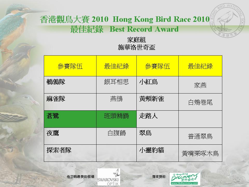 家庭組最佳紀錄:蒼鷺隊 斑頭鵂鶹