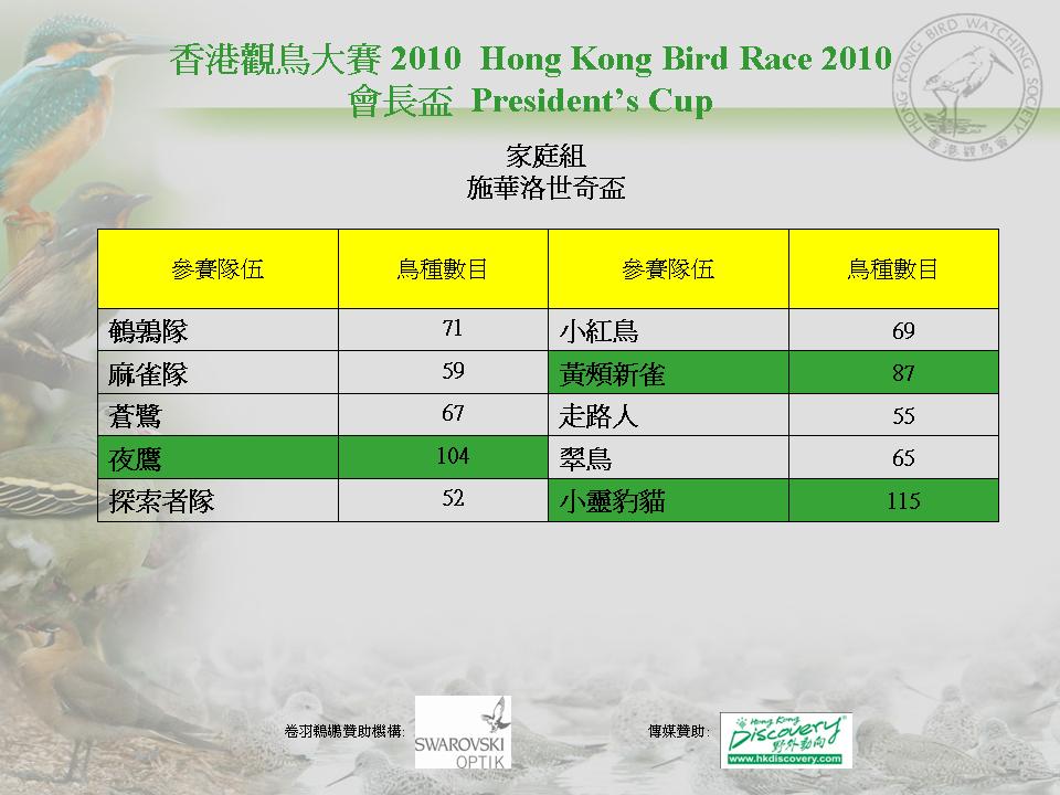家庭組施華洛世奇盃冠軍:小靈豹猫 亞軍:夜鷹 季軍:黃頰新雀