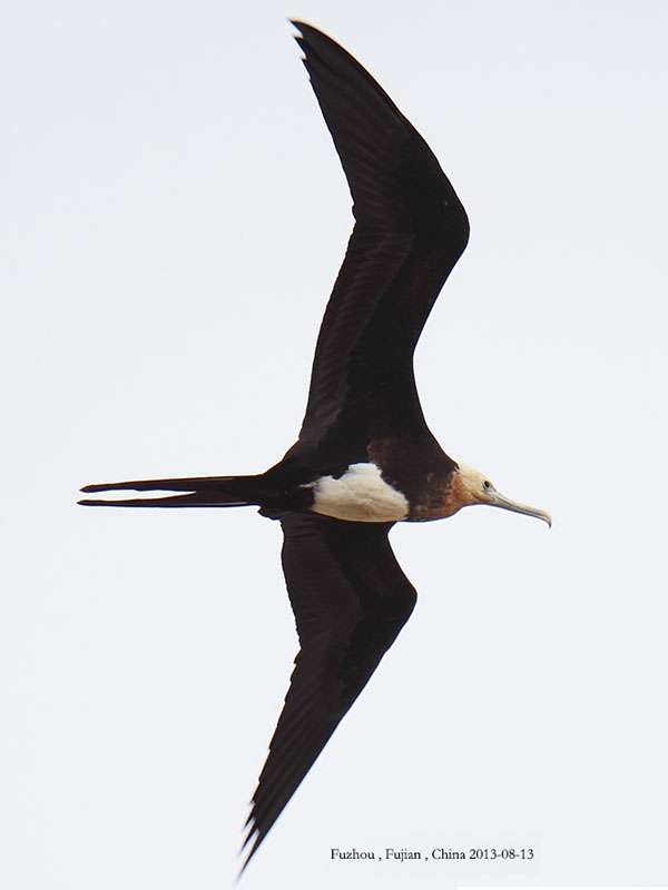 This is a Frigatebird photo taken in Fujian, China on Aug 2013. I believe this is a Great Frigatebird. If confirmed, this would be a first for Fujian province. So I like to get second opinions on its id. Thank you.