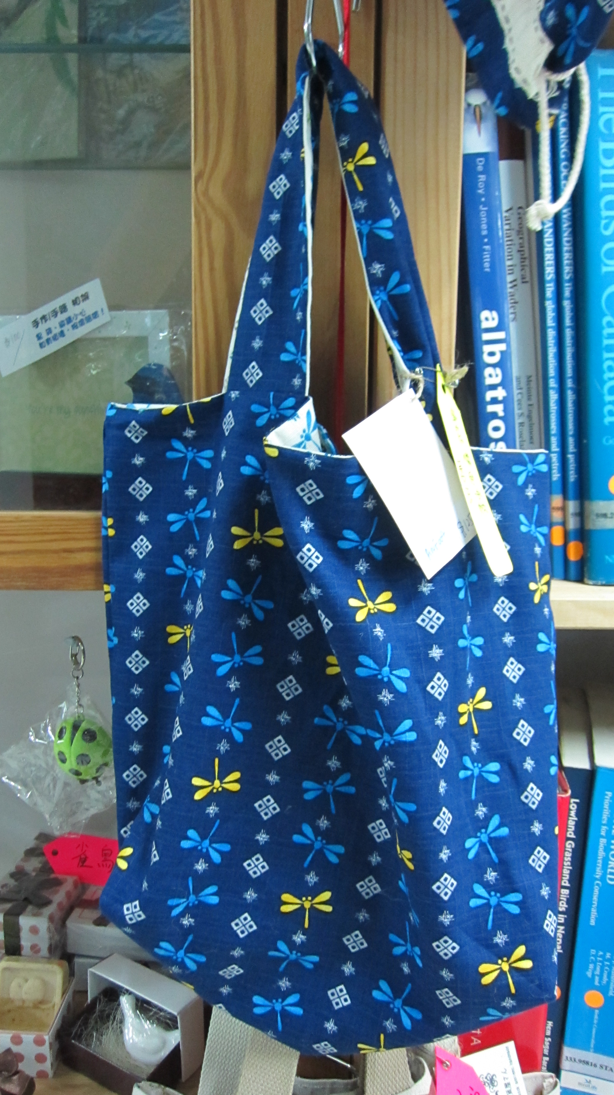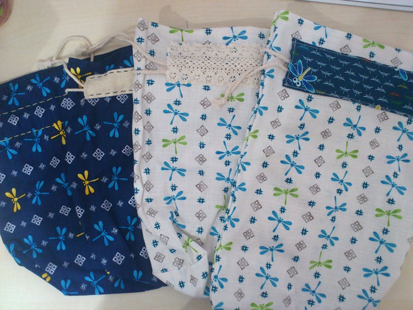 分別有雀鳥麻布袋(1藍,1紅)、小小森林布袋、蜻蜓雙面布袋及蜻蜓索繩袋~~