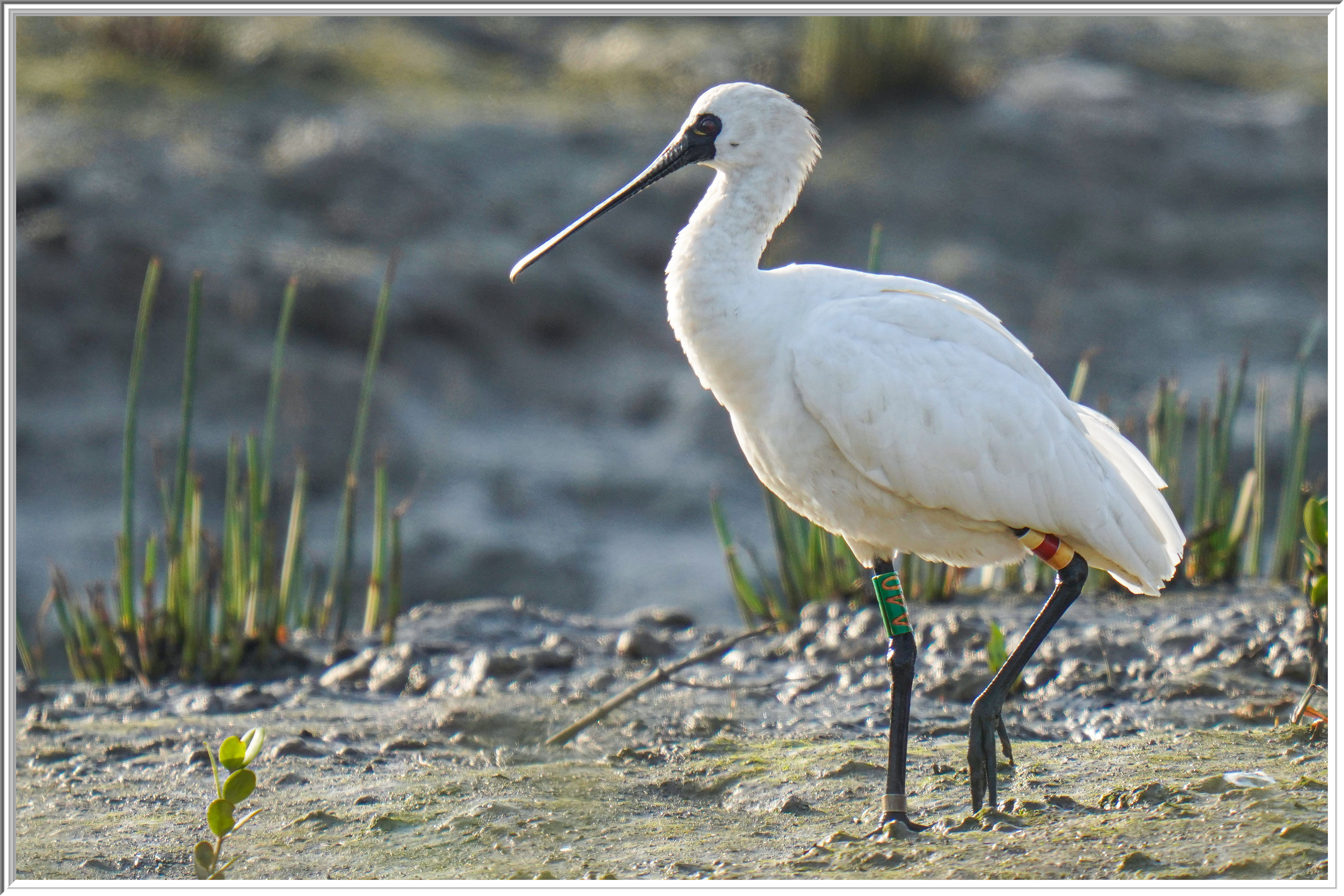 A40的左腳是白/紅/白,不過之前鳥友的相片已看到白色部分不久已漸變黃,看看這隻黑琵是不是A40? 牠看來很健康和合群。