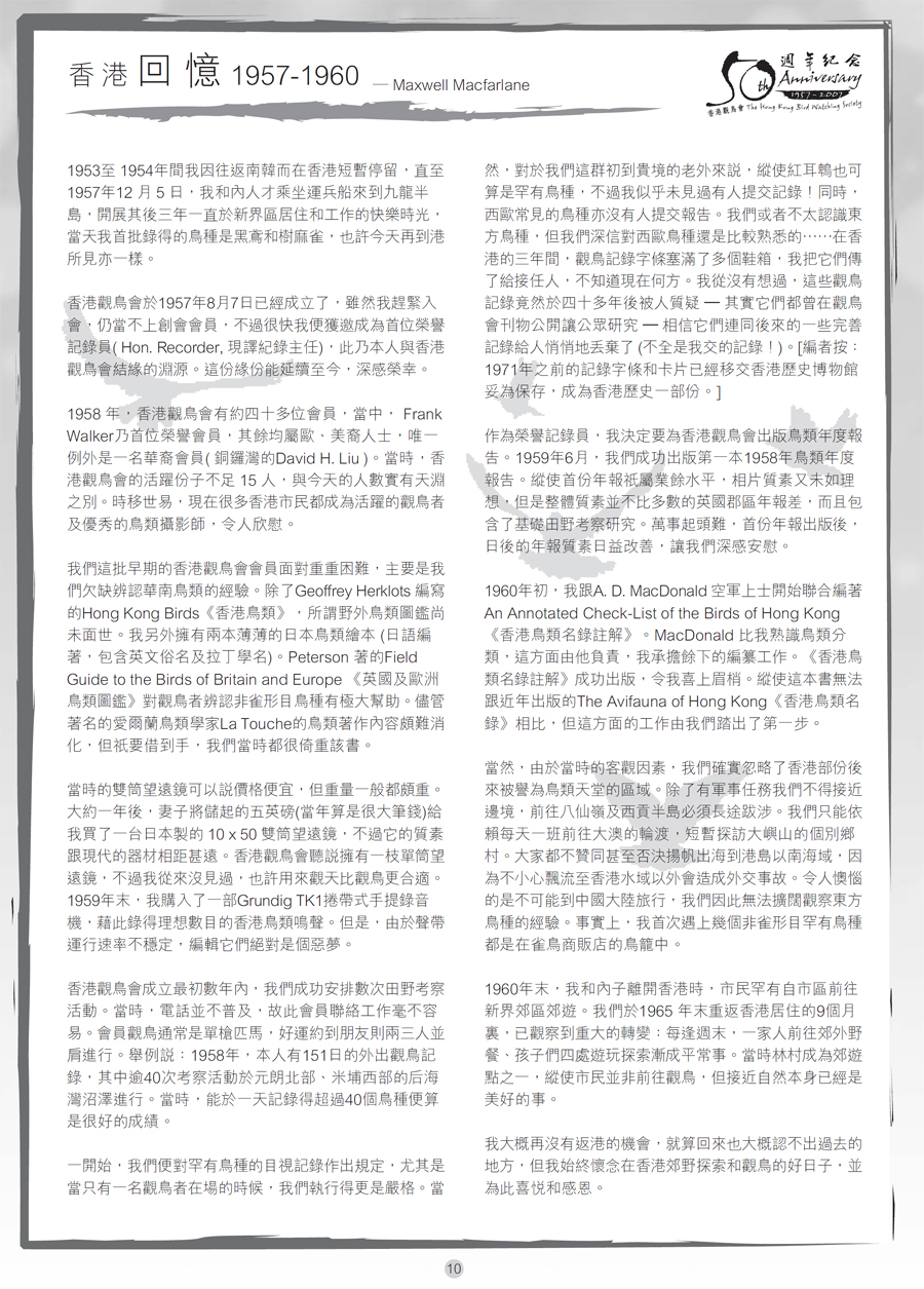 Mr. Macfarlane於1960年調任他處,但在1965至66年返港逗留了9個月,期間與J. Caunter更新了“Annotated Check-List of the Birds of Hong Kong”,並於1966年出版。