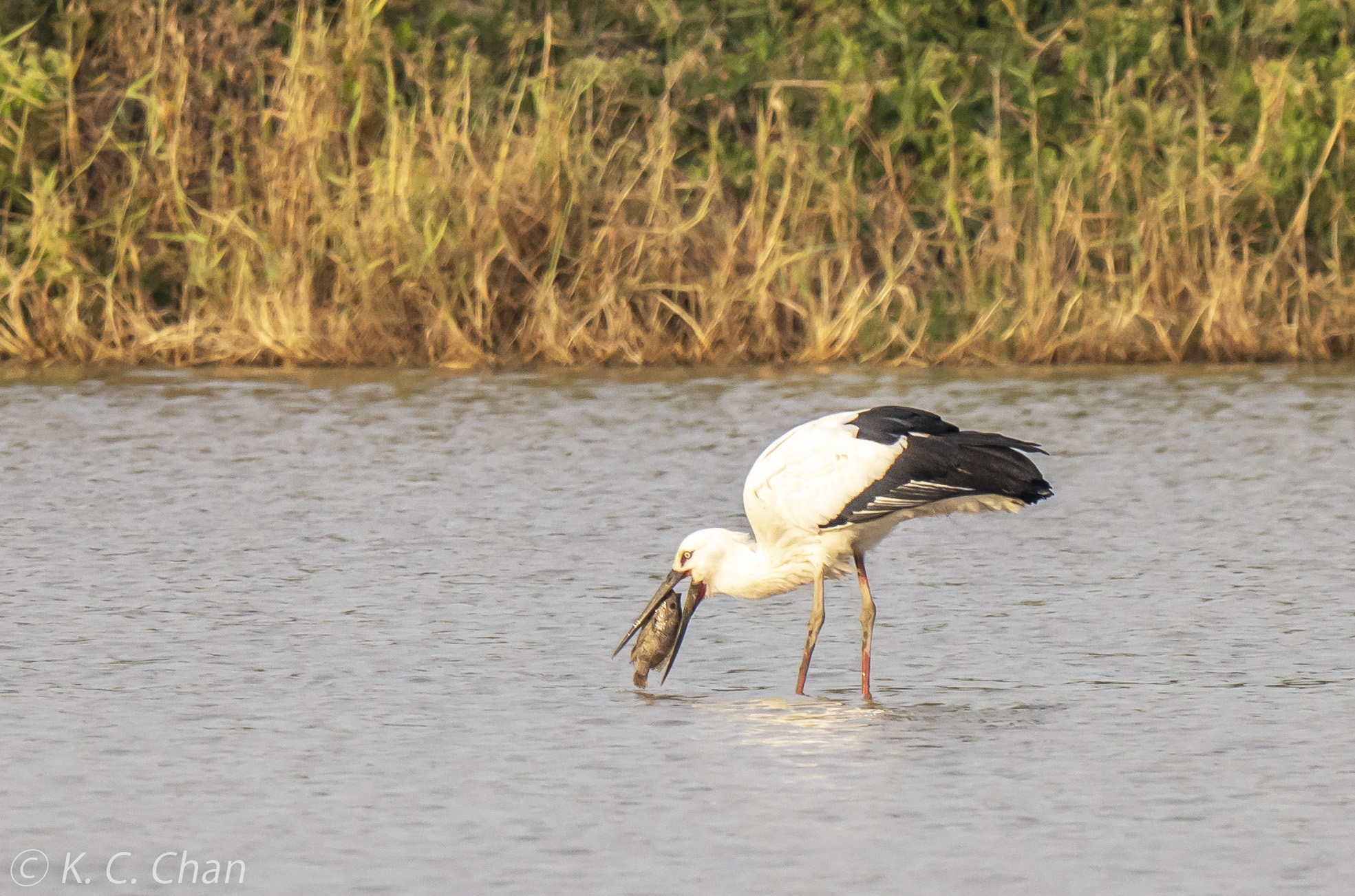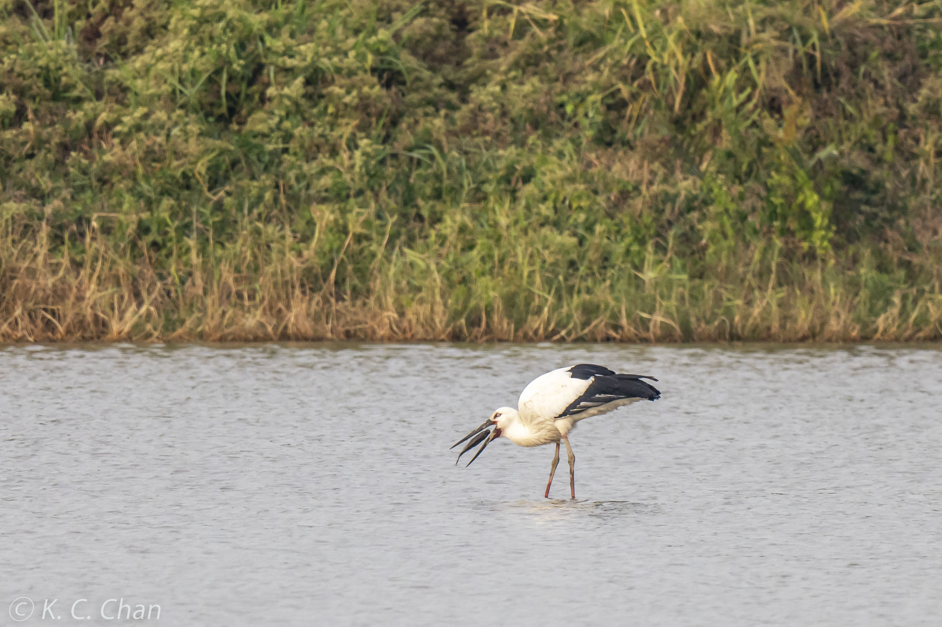The bird struggled to swallow a big fish for about 15 minutes. With determination, the bird finally gulped down the whole fish.