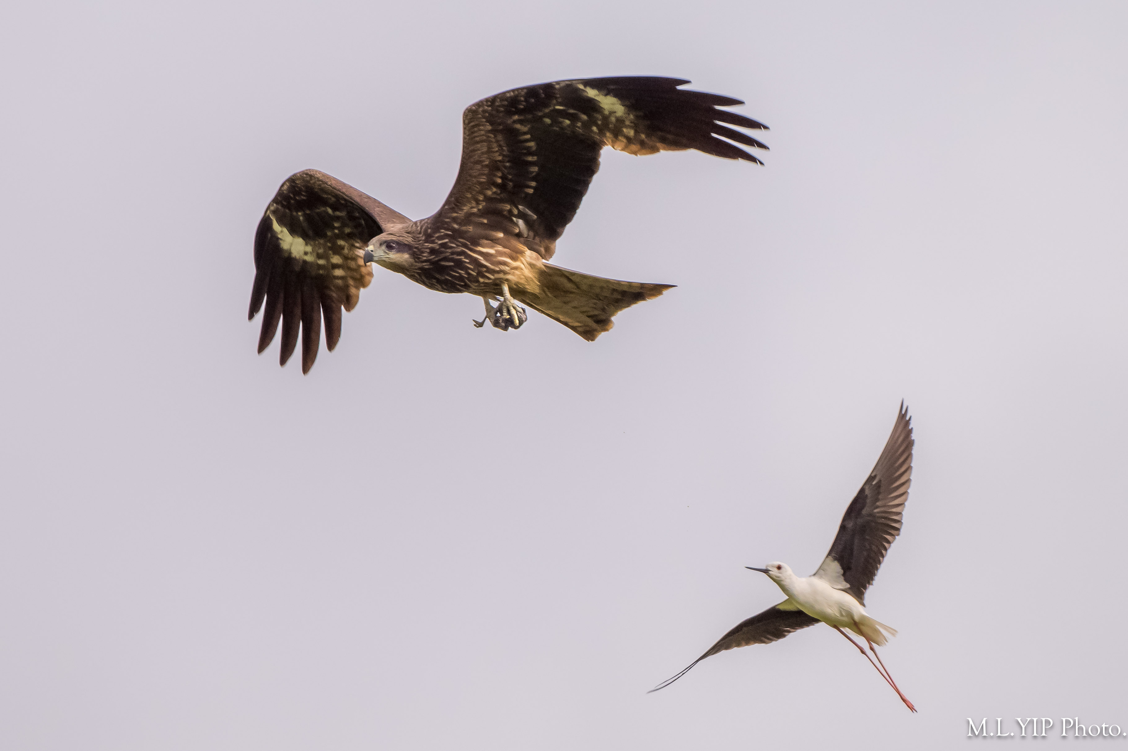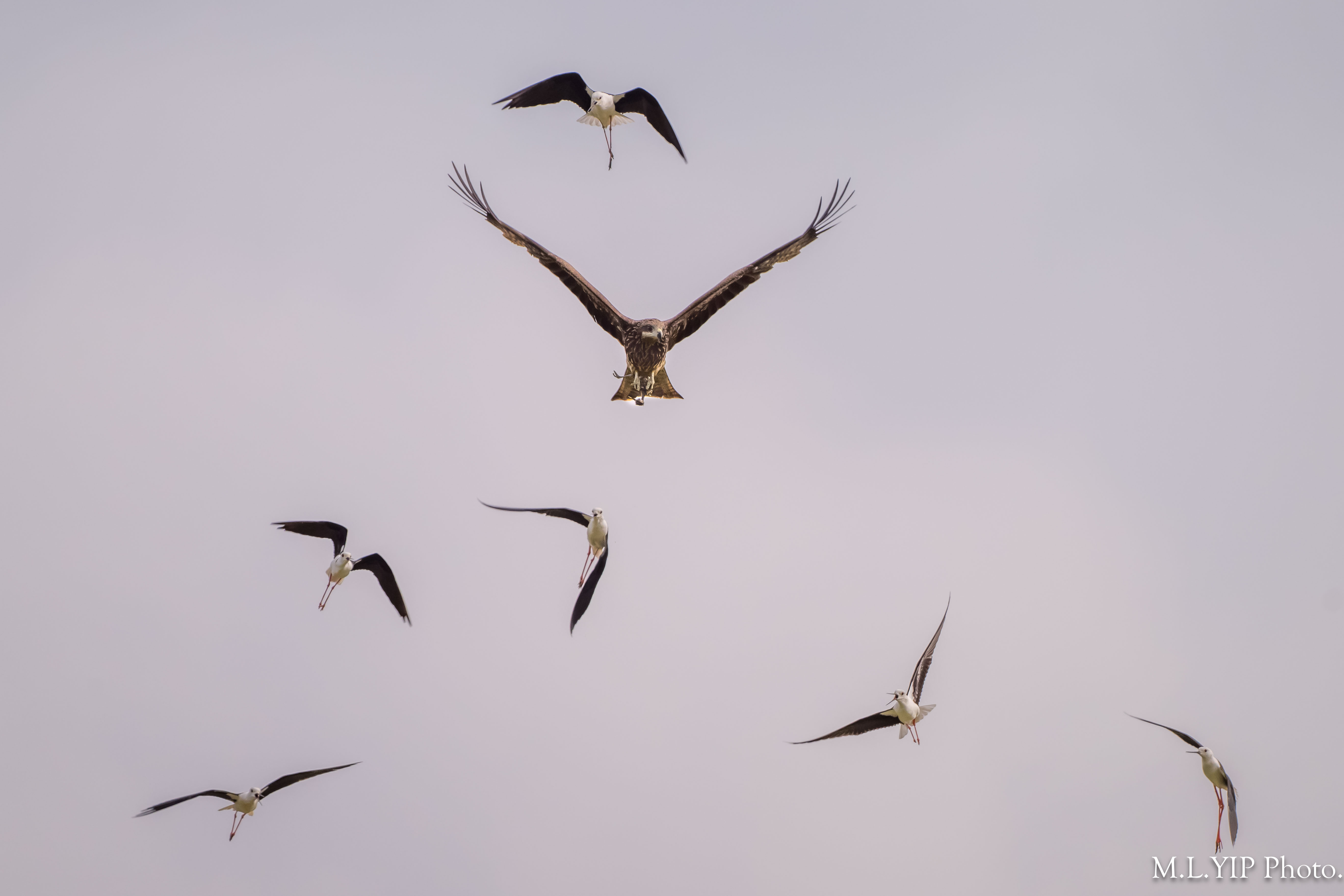 聽到黑翅長腳鷸群起大叫,才見到一隻麻鷹似捉了一隻黑翅長腳鷸的幼鳥.