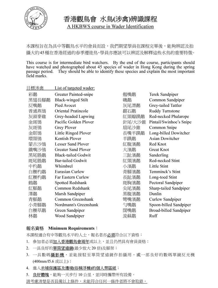 水鳥(涉禽)辨識課程 (21/3開班) A course in Wader Identification