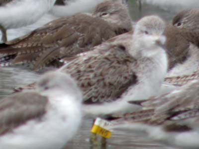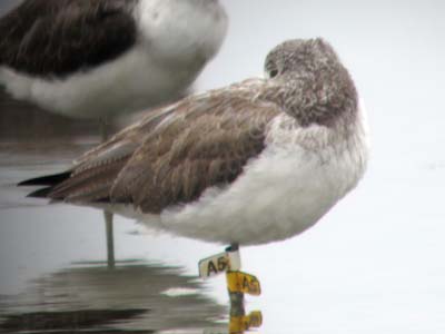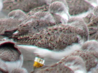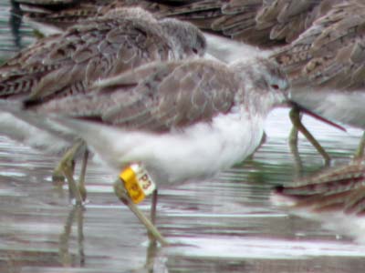 Also had an Adult moulting Great Knot (among a flock of 600-1000 spring adults) that had a metal ring on its Left Tibia and Black over White Tags on its Right Tibia. Any ideas?