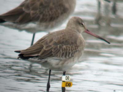 1 was an adult Spring Bar Tailed Godwit. It had a large White tag on its tibia, possibly also yellow tag on tarsus. Numbers were not visible.