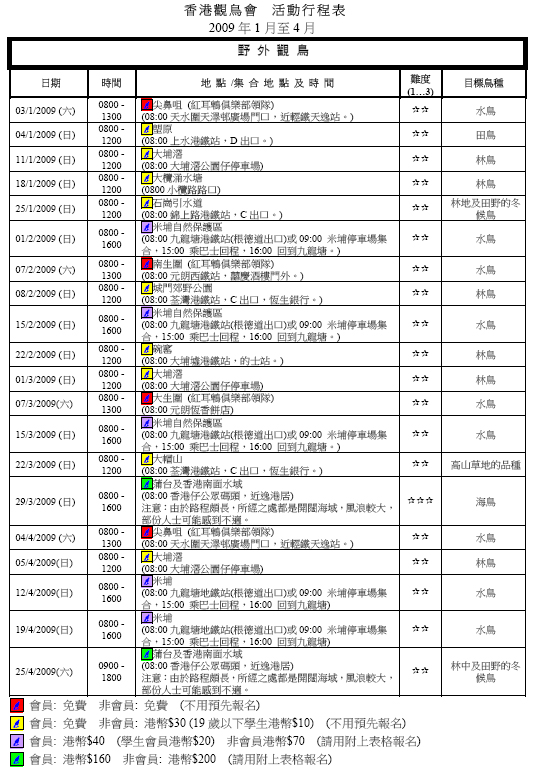 (*請注意,過去沒有向「非會員」徵收費用的部份戶外觀鳥活動,從2009年1月開始將有所調整,詳情請參閱附表。)