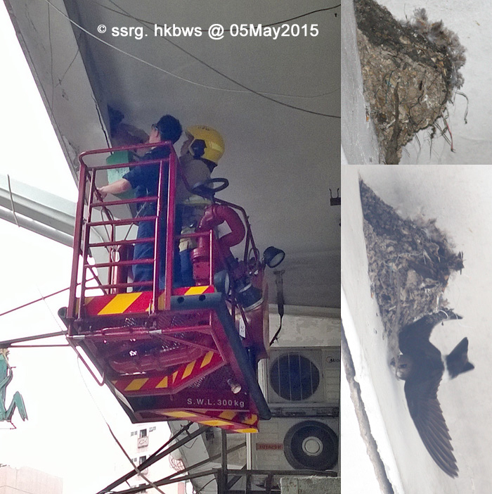 2015年5月5日,中午12時,香港觀鳥會燕子研究組(簡稱:燕子組)義工進行周年燕巢普查時發現一隻小白腰雨燕因腳被築巢的材料纏住,被困於巢上,不能脫身。