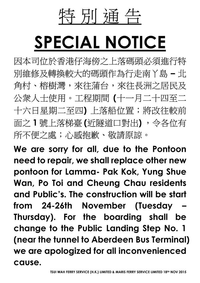 We are sorry for all, due to the Pontoon need to repair, we shall replace other new pontoon for Lamma- Pak Kok, Yung Shue Wan, Po Toi and Cheung Chau residents and Public’s. The construction will be start from 24-26th November (Tuesday –Thursday). For the boarding shall be change to the Public Landing Step No. 1 (near the tunnel to Aberdeen Bus Terminal) we are apologized for all inconvenienced cause.