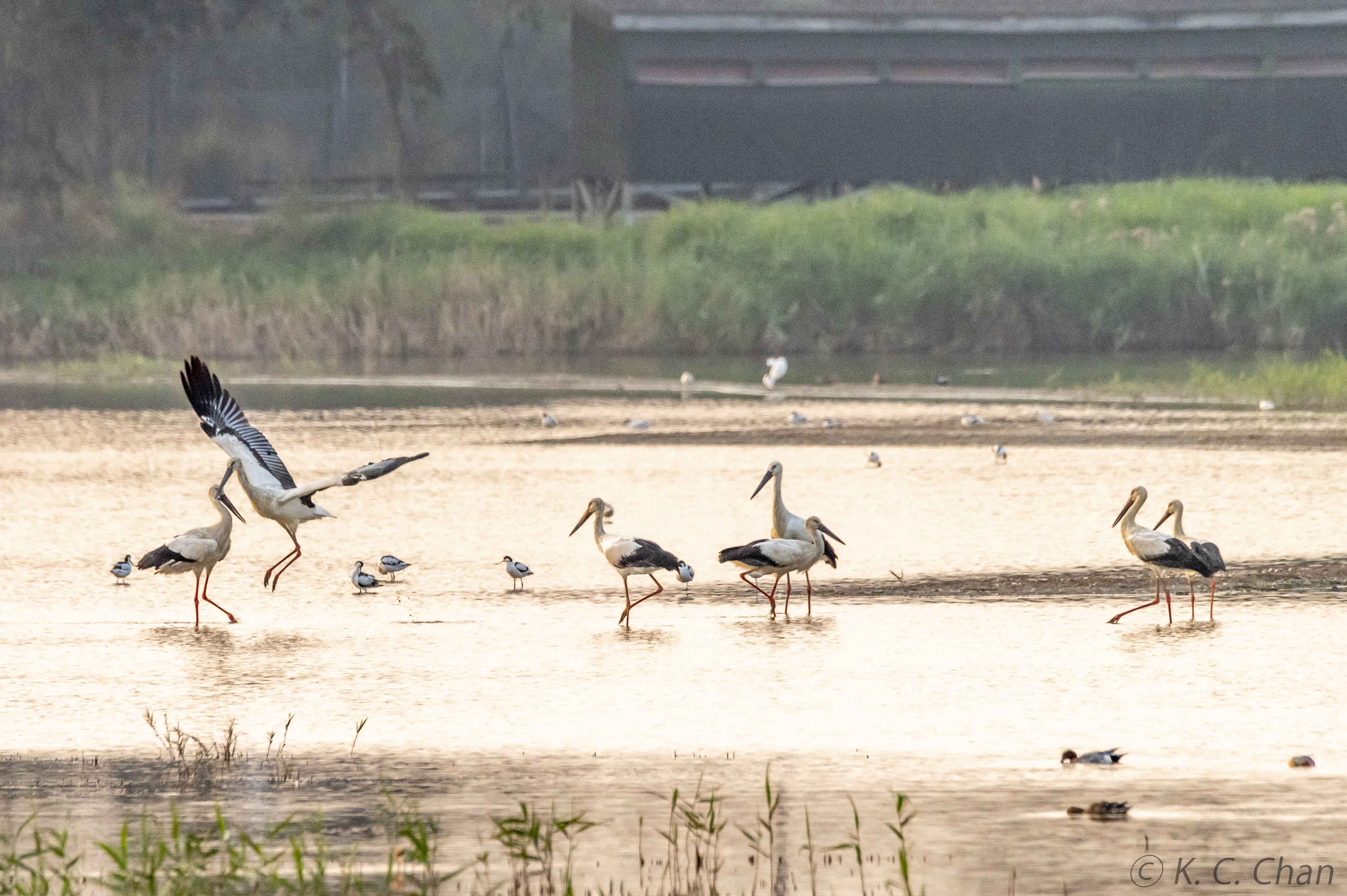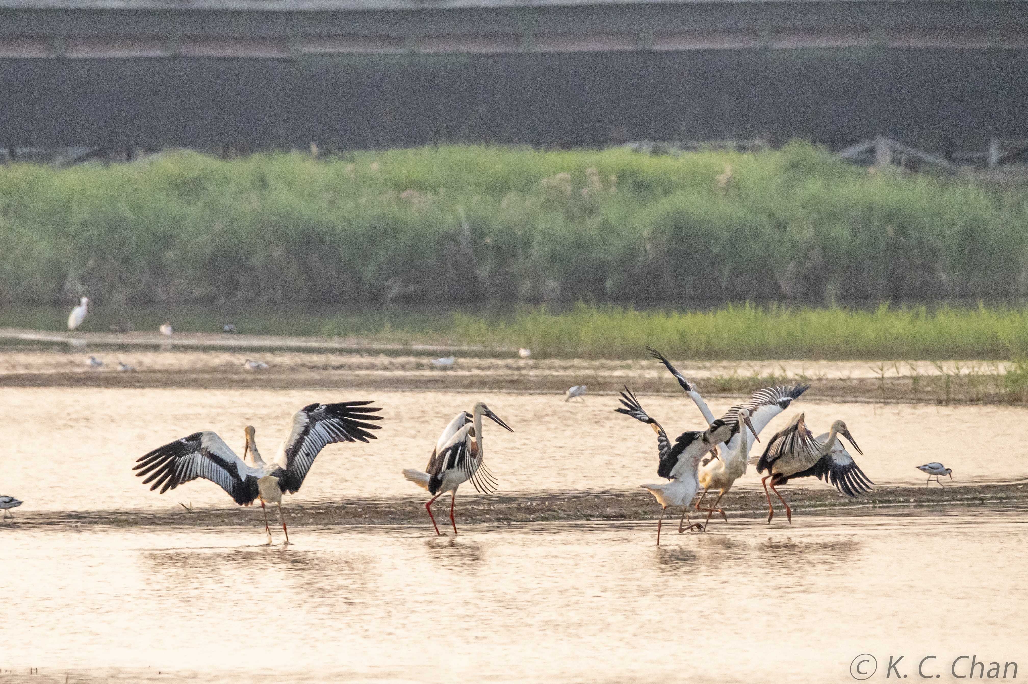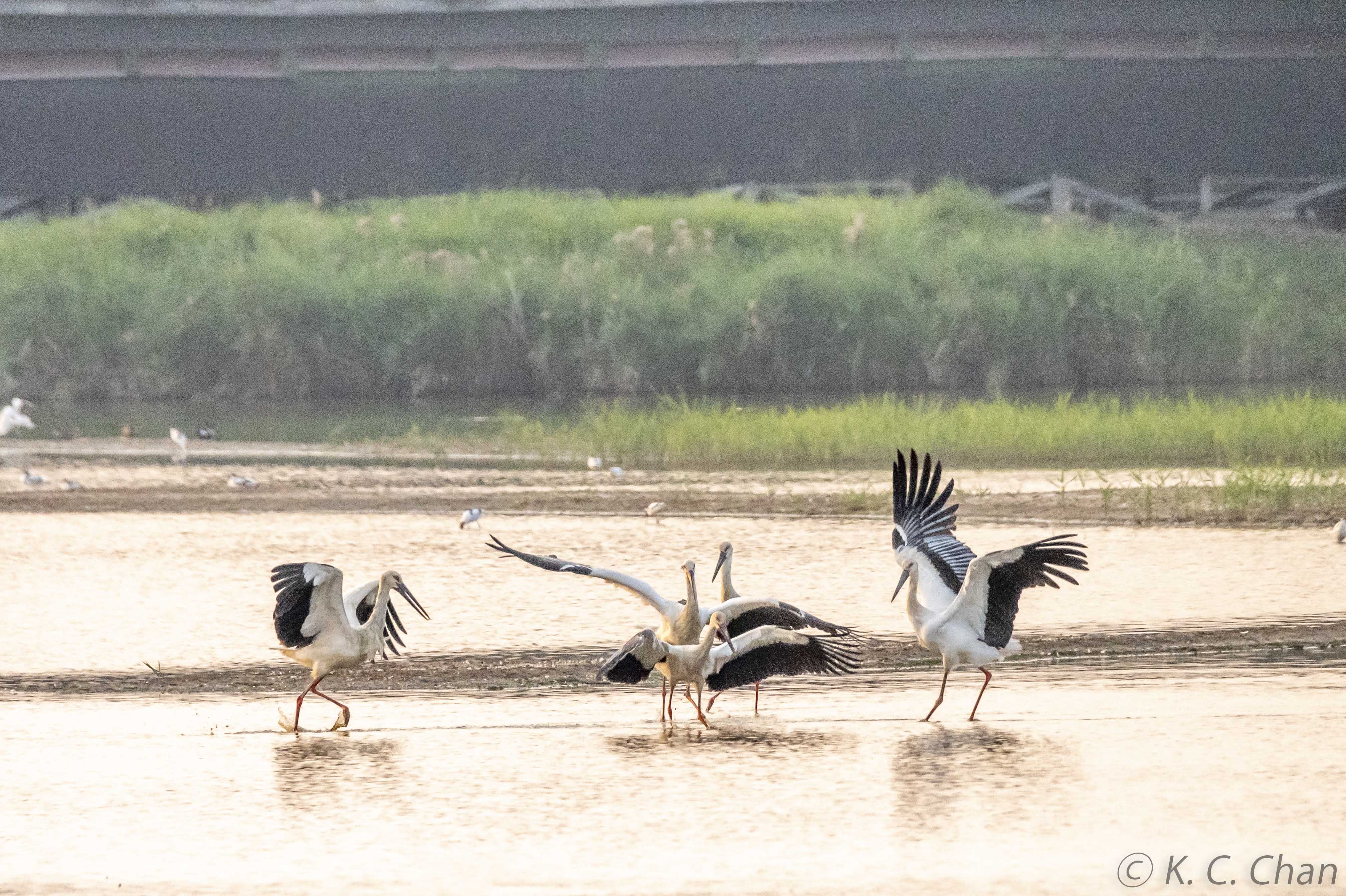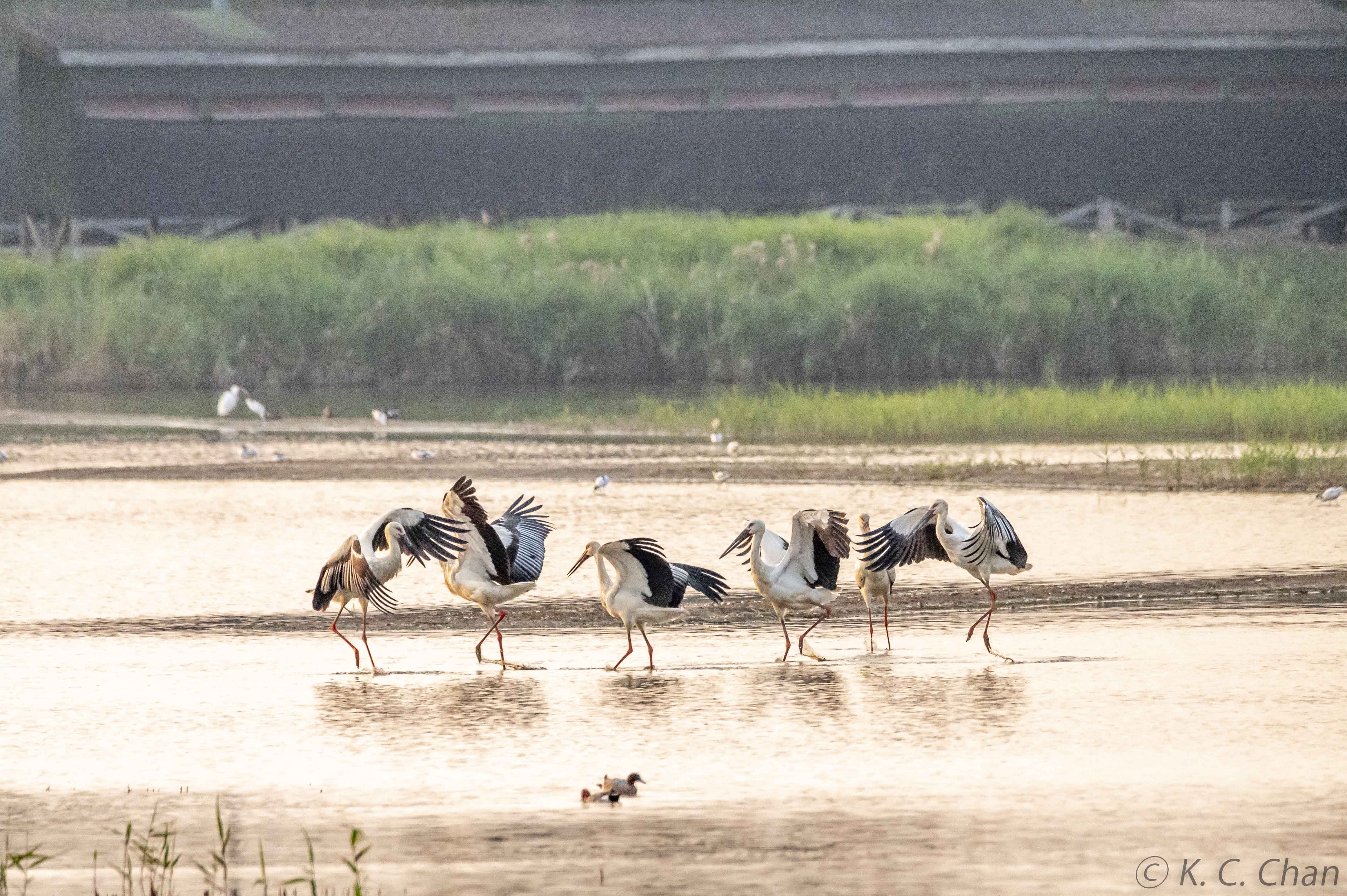 Oriental Storks having fun in sunset