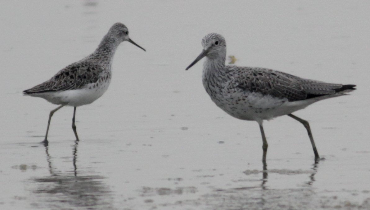 The two a fairly similar, but notice that the Greenshank is larger with a thicker bill (Marsh Sandpiper has a very thin, needle-like bill). If you look closely you will also see a difference in the upperparts, especially tertials - Greenshank has white spots ('notches') along the edges whereas Marsh Sandpiper has darker markings across the feather.