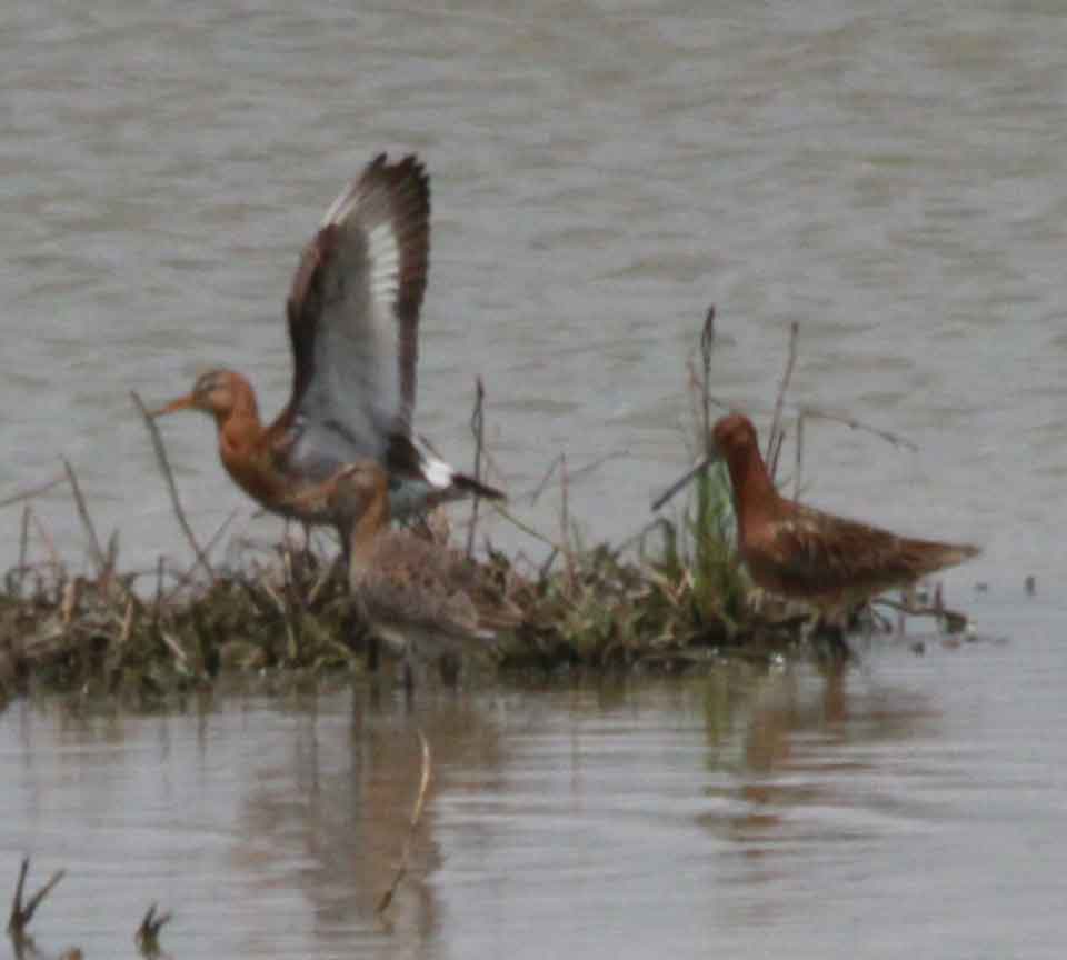 The reddest bird, on the right, is an Asian Dowitcher - note the very dark grey (if not in fact, blackish) rather tubular bill, deeper at the base.