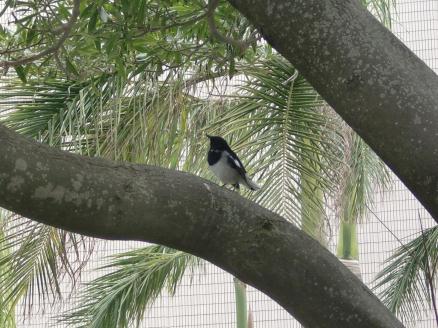Can I get help with bird identification? It looks sort of like an Oriental Magpie Robin except that it seems to have a shorter tail and a small faint white necklace.