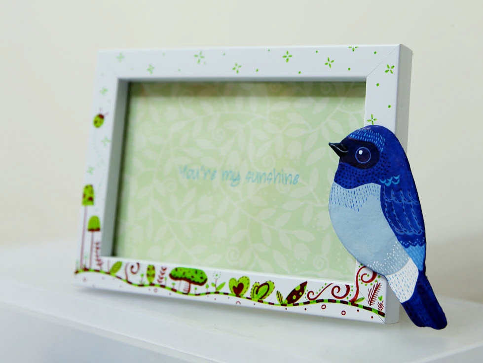 Bulbul's Art hand made photo frame is available for sale in our office. The photo frame comes with hand drawing of natural patterns and a clay bird ornament by