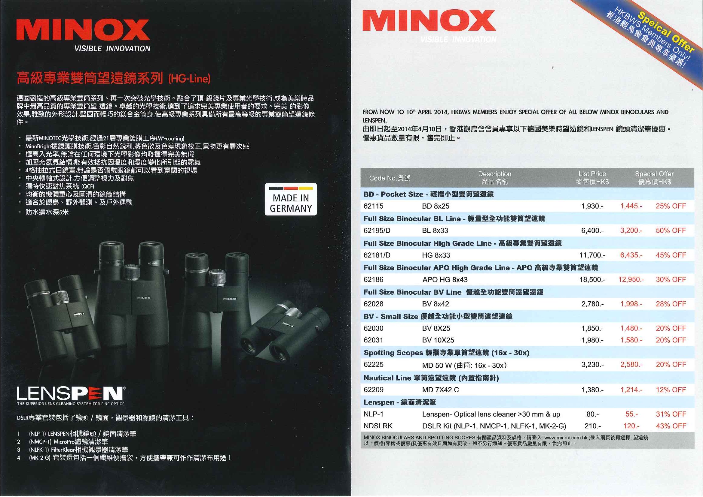 美樂時望遠鏡優惠Special Offer of Minox Binoculars 2014-01~2014-04