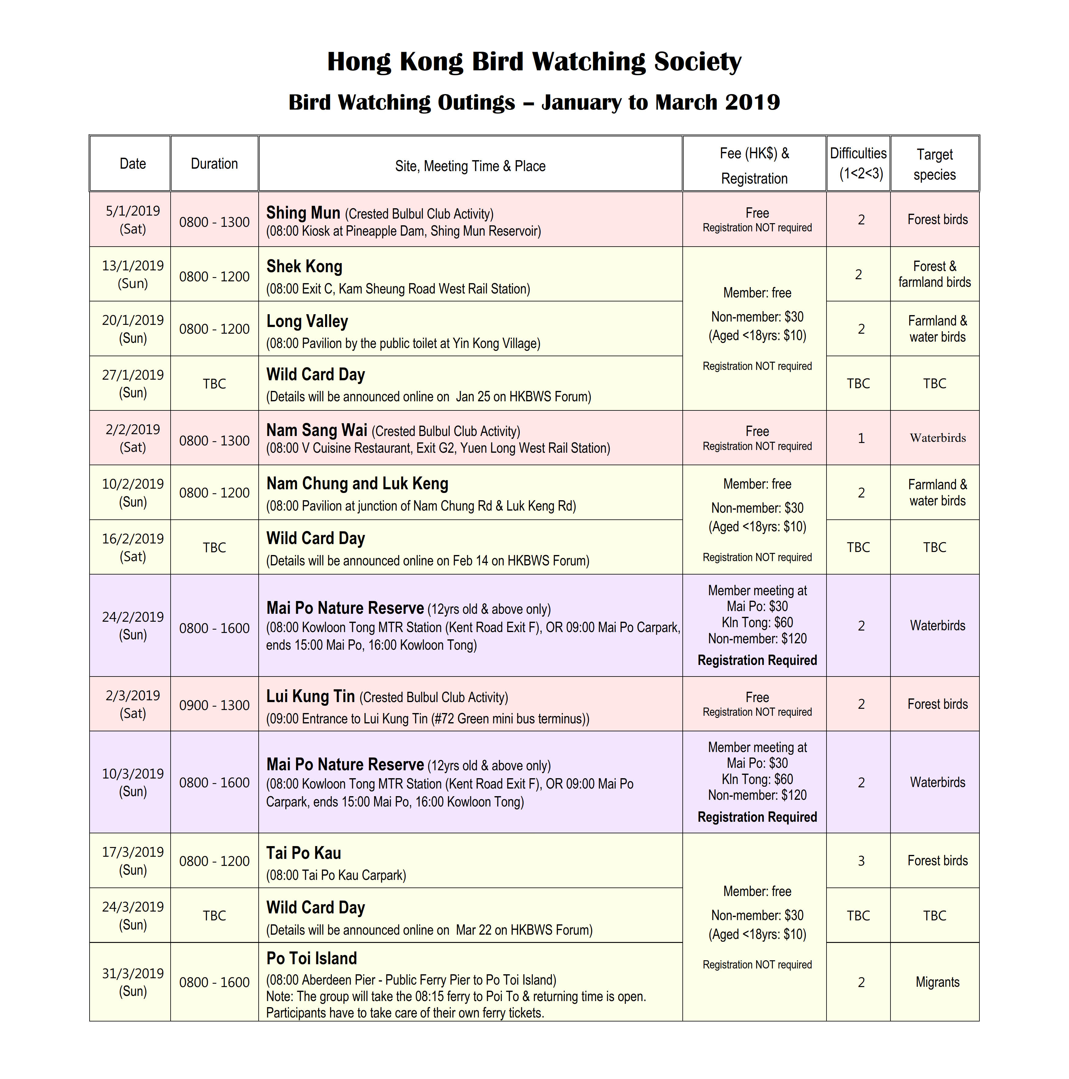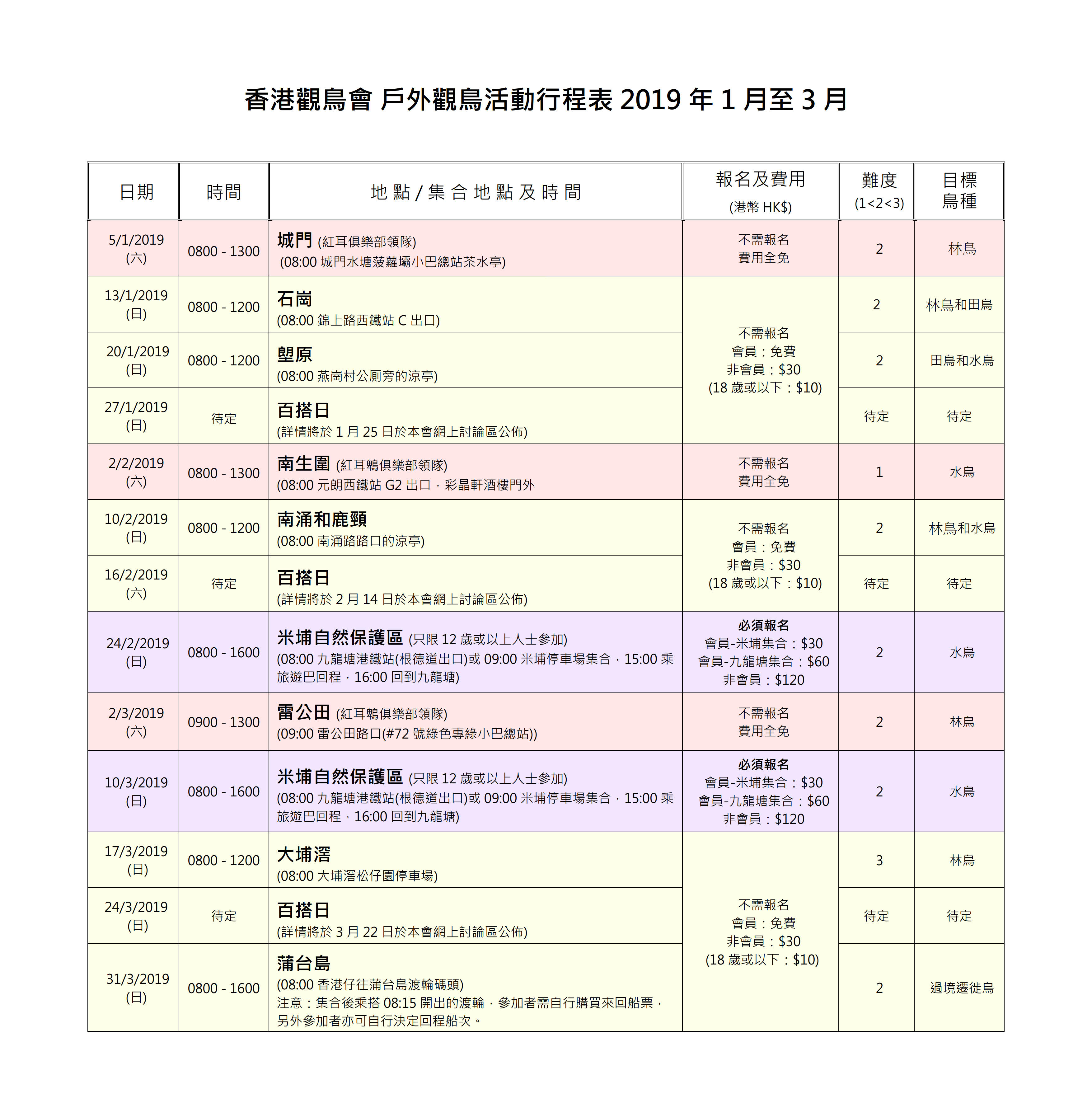 2019年1-3月戶外觀鳥活動時間表 Jan-Mar 2019 Outing Timetable