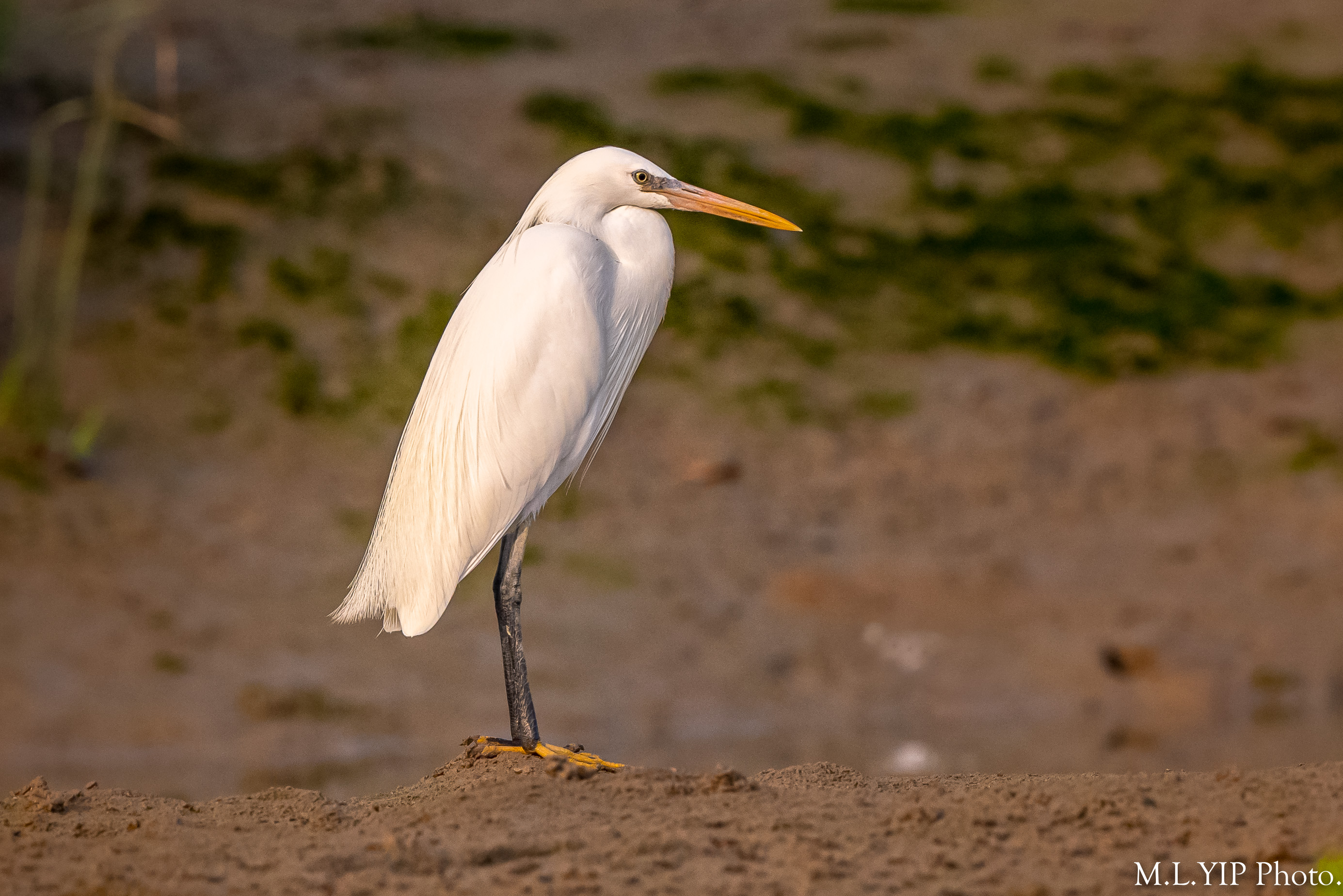 拍這張照片的時間是7:11. 這黃嘴白鷺已經佇立在泥灘一隅,迎接新的一天.