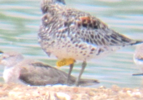 Bird 1. I think the left leg combination is actually Yellow, Red, Green. I realise the green is not very obvious on this bird, but I think that is due to the light. It is also important to note that this is a yellow flag, not a colour ring (also very important to note that this is on the lower leg).  This bird is part of an ongoing study in Australia and China looking into refuelling behaviour by Great Knot, Red Knot and Bar-tailed Godwit.