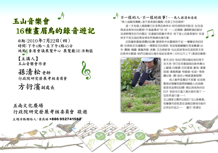 並以所著作之『玉山音樂會-16種畫眉鳥的錄音遊記』一書,介紹鳥類採集錄音記事及過程。