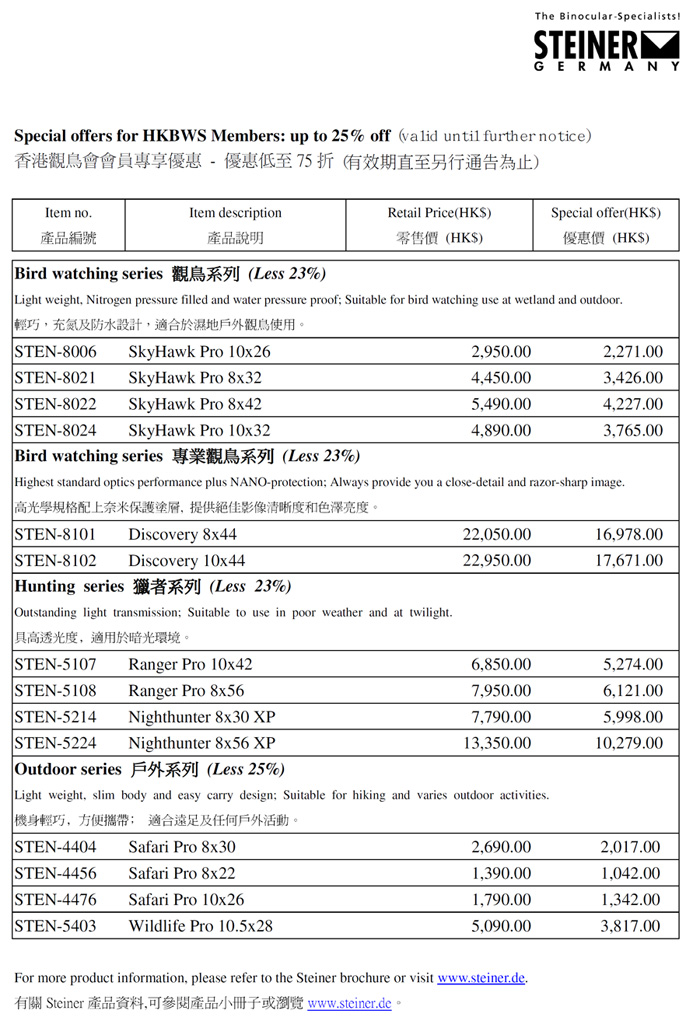本會得到『瑞士維氏鋼刀香港有限公司』的支持,會員可以優惠價購買Steiner望遠鏡,公司更會捐出銷售額約10%予本會,訂購方法如下: