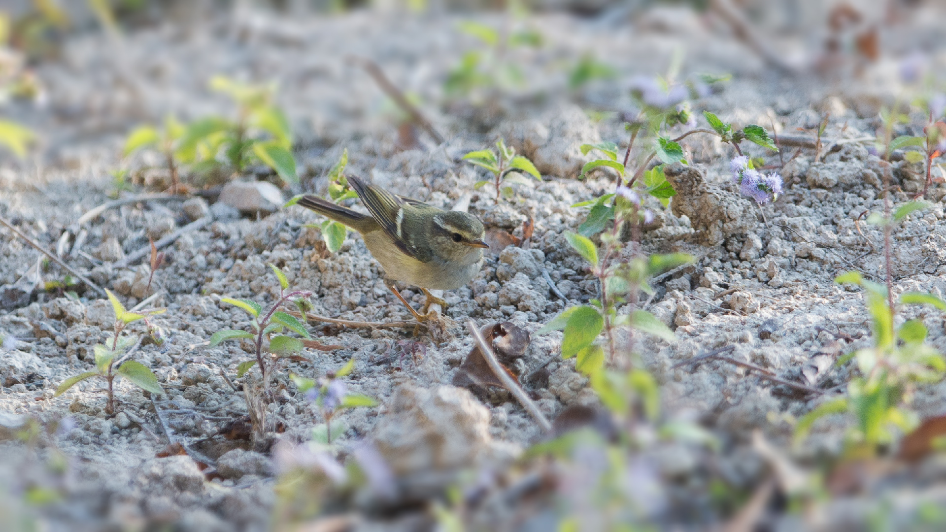 It's a Yellow-browed warbler - it has two broad wing bars, pale fringes to the tertial feathers and dark base to the secondary feathers. It's unusual for them to feed on the ground, but they sometimes do this in cold weather.